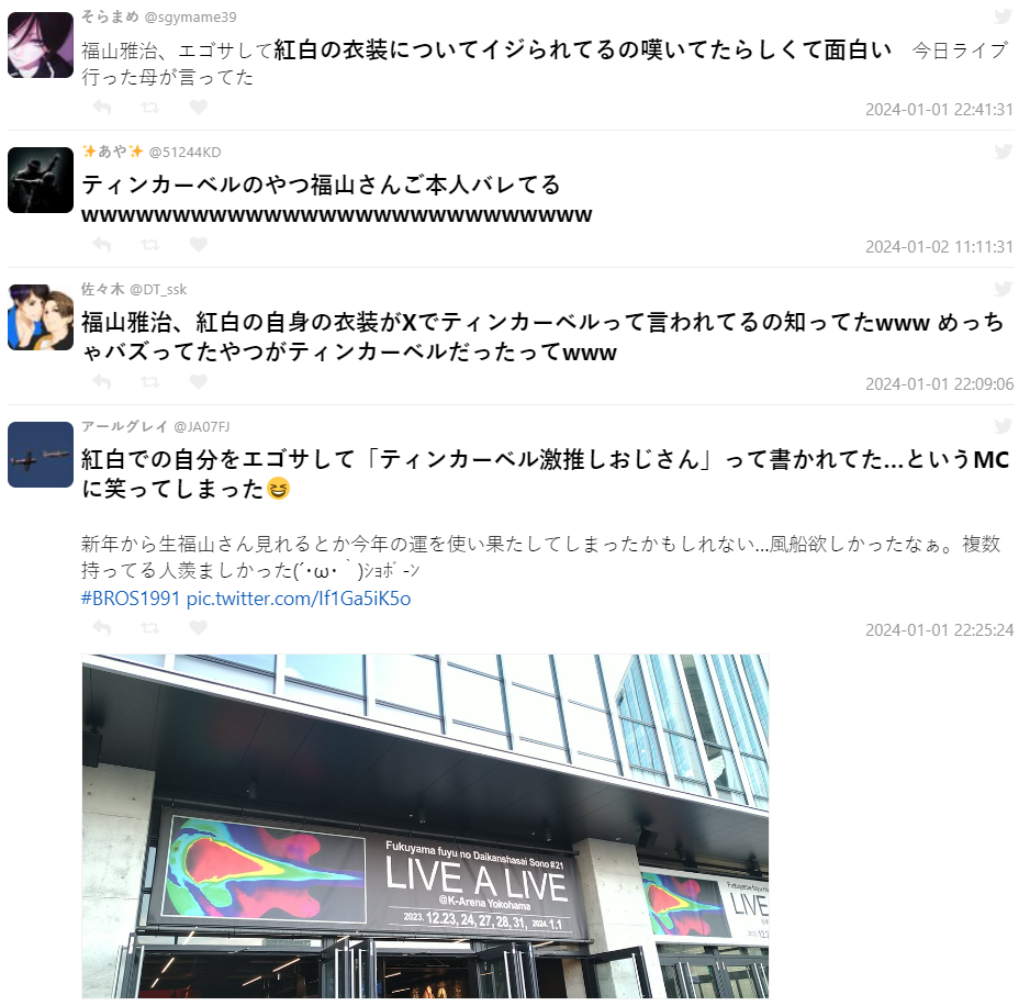 有名網友表示,為何福山雅治今年紅白的服裝看起來像是《彼得潘》裡仙子小叮噹激推的大叔,整套服裝像極了小叮噹的服裝,完全沒想過這套衣服居然會是福山的選擇。