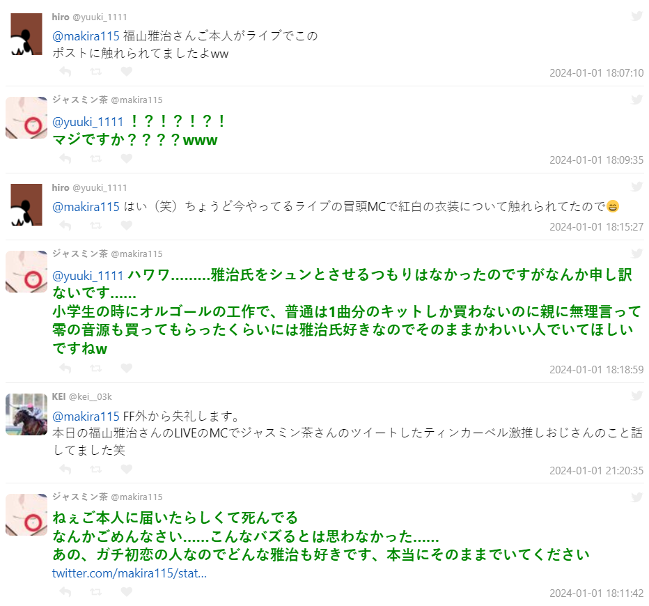 沒想到隔日 ( 1/1 ) 的福山雅治在現場演出時,就提到這位網友的發文,調侃自己是一個「小叮噹大叔粉絲」,逗得全場觀眾歡笑,也讓這位發文的網友成為網路焦點。