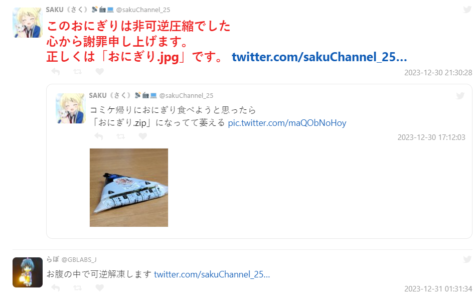 不過有網友指出,這飯糰應該無法解壓縮回去了,應該要稱作「御飯糰.jpg」才對,各位網友真的是很認真討論這件事 ( ? )