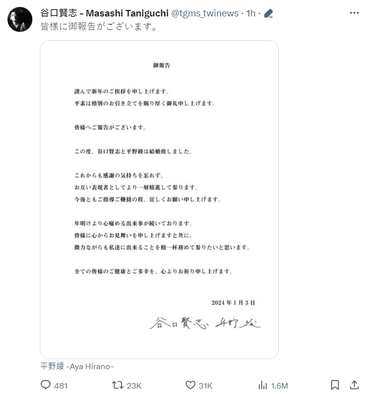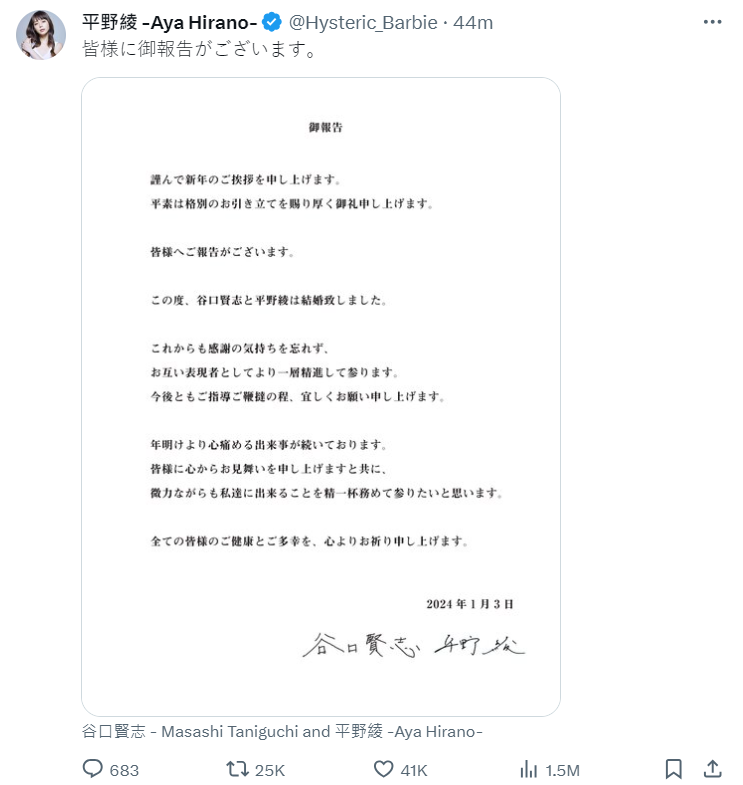 平野綾與谷口賢志兩人都在個人 X 上報告這項消息,兩人都身為表演者會更加精進自己的才能,並希望各位粉絲鞭策他們,更努力在業界發光發熱。