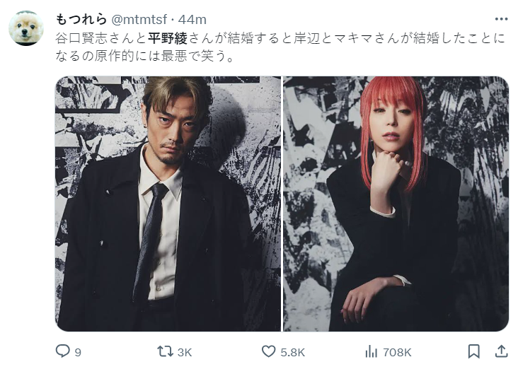 然而事實上,兩人最近的合作就是在《鏈鋸人》 真人舞台劇, 平野綾與谷口賢志分別飾演真紀真與岸邊,這樣的組合也被網友開玩笑說是完全料想不到的組合,在原作中可說是最糟的搭配 XD。