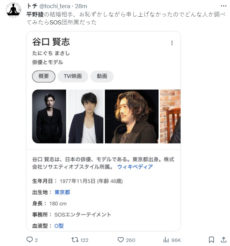 更有網友發現,谷口賢志所屬的經紀公司 Society of Style Co., Ltd 縮寫為 SOS 娛樂,剛好跟平野綾代表作《涼宮春日的憂鬱》中的 SOS 應援團同名,真的非常巧合。