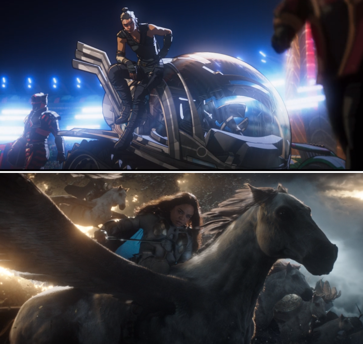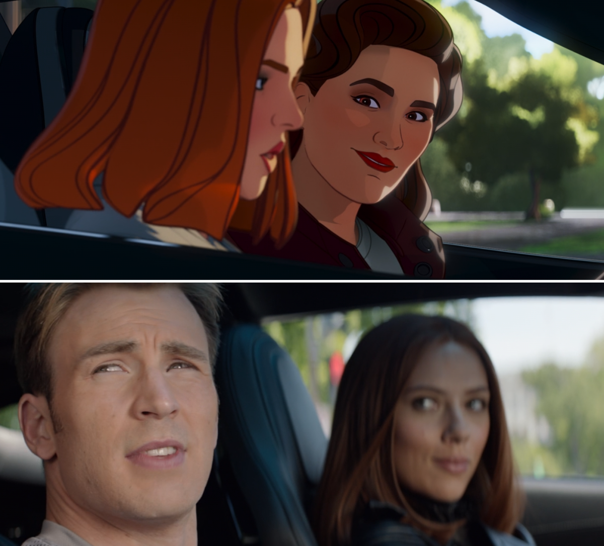 時間來到《美國隊長:酷寒戰士》的對應時間點,卡特開著超跑找上正在晨跑的娜塔莎,這當然對應了《美國隊長:酷寒戰士》開場「獵鷹」山姆威爾森初登場的橋段,只不過當時開超跑的是娜塔莎。