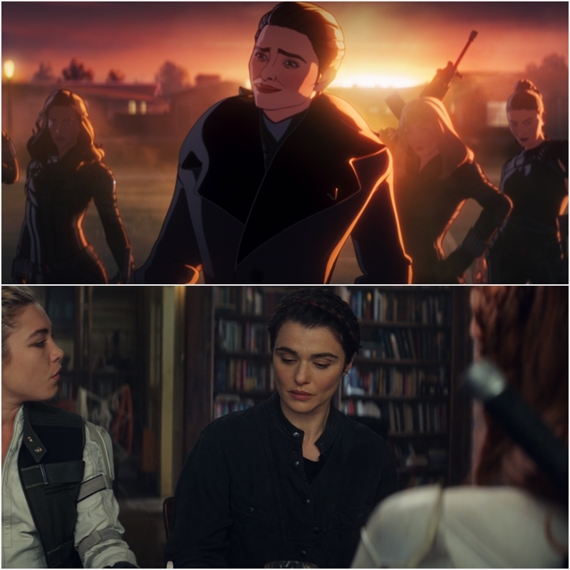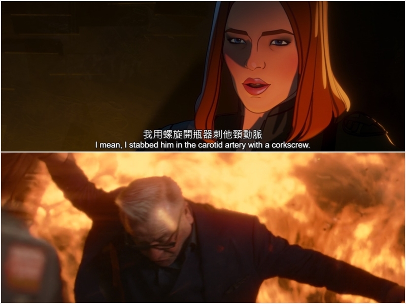 這個宇宙的娜塔莎說,她用螺旋開瓶器刺死了紅屋首領 德雷科夫(Dreykov),而在主宇宙中,德雷科夫則是因為被二代黑寡婦葉蓮娜·貝洛娃破壞飛機引擎而被炸死。