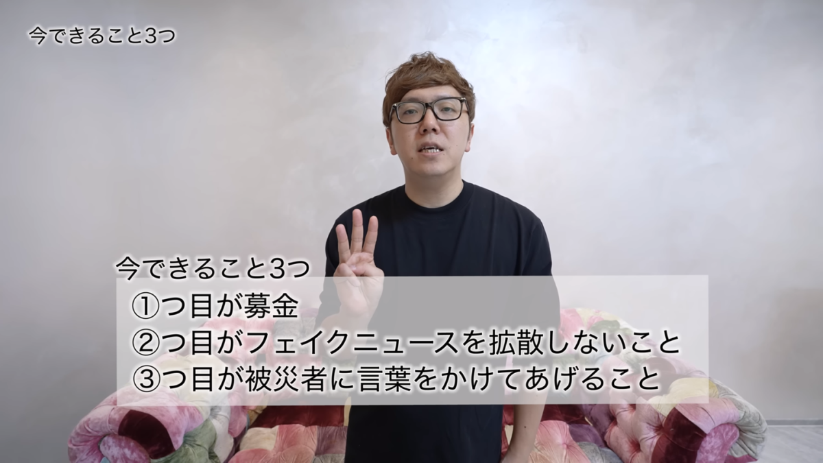 HIKAKIN 提到,現在如果你想幫助這些災民的話,就做到下列三件事情即可,第一是募集捐款,第二是不要傳播假消息造成混亂,第三就是盡量和受害災民交談,透過網路也可以,讓他們感受到社會的支持。