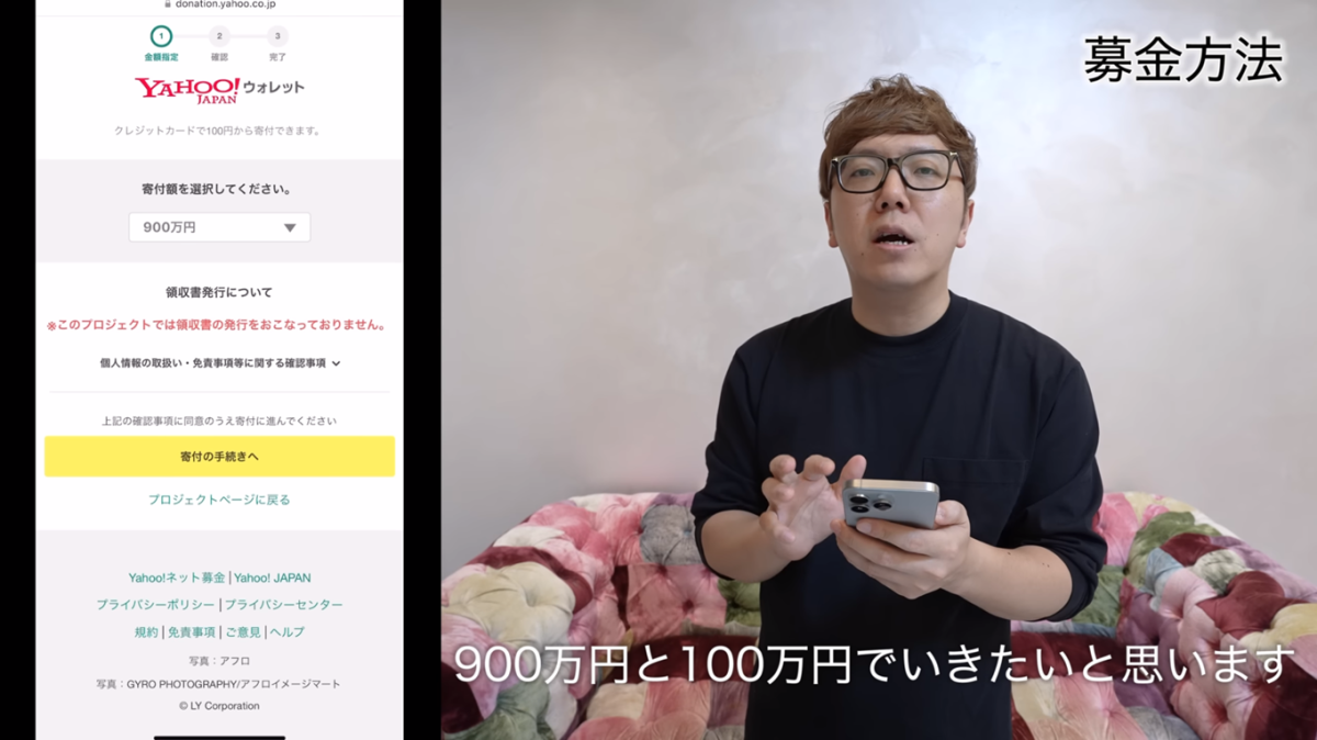 由於網路募款金額單筆上限是 900 萬日圓,所以他分成兩次 900 萬與 100 萬捐出,也呼籲大家盡己所能就好,不需要勉強自己的能力。