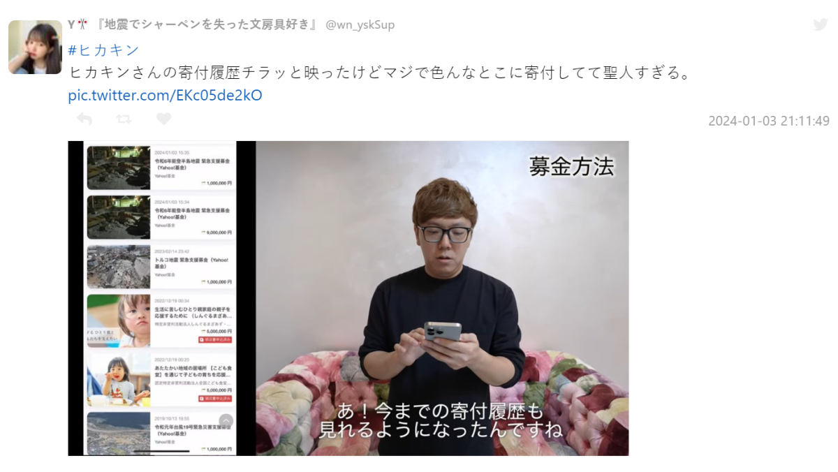 不過影片中也顯示了過去 HIKAKIN 捐款的紀錄,發現他幾乎每年都捐超過百萬日圓回饋社會,更是對他熱心公益幫助社會的行為感到讚賞。