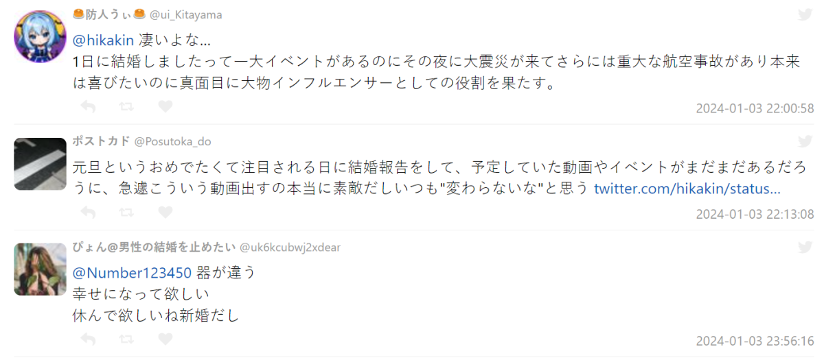 甫剛宣布結婚的他,由於日本 1 月 2 日發生能登半島地震,隔日他立刻發布影片表示自己會捐出 1000 萬日圓幫助賑災,並對粉絲網友呼籲現在該做的事情,也引起網友熱議並讚賞他的所作所為。