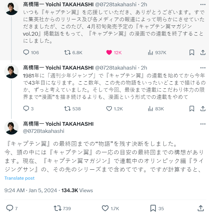 其系列作者高橋陽一宣布,該系列因作者身體衰退以及創作環境改變等因素,將於今年 4 月結束連載,讓這部連載延續 43 年作品劃下休止符,也提到了做此決定的想法規劃,希望粉絲能夠諒解。