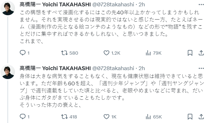 也提到漫畫本來就有有一個完結構想,包含現在連載中與之後的故事發展,但發現這些構想完全漫畫化可能還要 40 年以上才能完成,加上身體大不如前以及數位化的影響,漫畫創作速度減緩,只能做此決定。