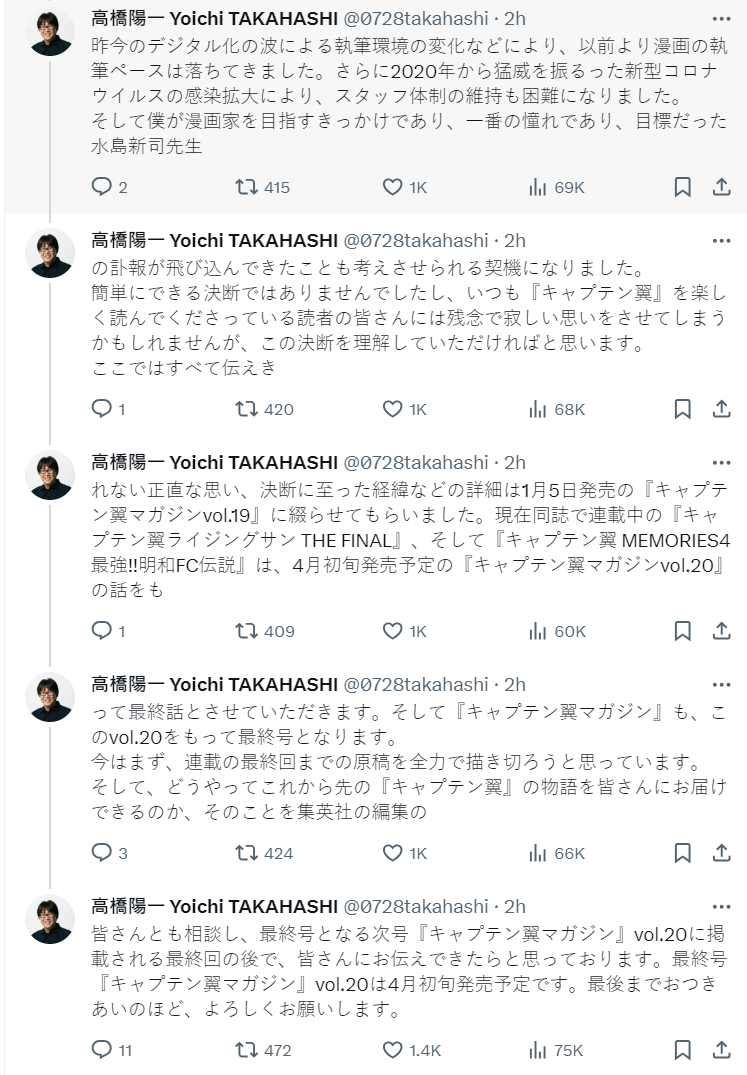 高橋陽一預告將會在 4 月初發售的「《足球小將翼》Magazine Vol. 20」完結,今日 ( 1/5 ) 日本發售的「《足球小將翼》Magazine Vol. 19」中,會有決定結束連載的詳細原因及過程。也提到現在身體的體力以及沒辦法負荷連載漫畫的壓力了,後續會考慮以其他形式讓粉絲了解未來故事的規劃。