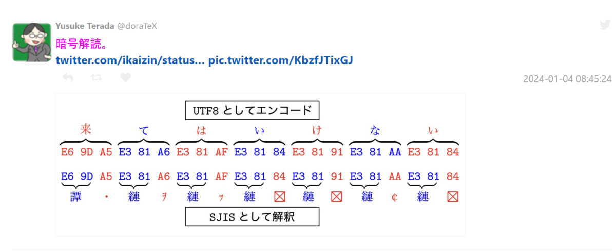 結果被網路上的神人網友發現,這是一個 Unicode (UTF-8) 的編碼轉換文字,回歸日文文字就是「来てはいけない」 ( 請不要前來 ),當然就是希望這一天你不要前來,不過相信也沒有 12/32 就是了 XD。
