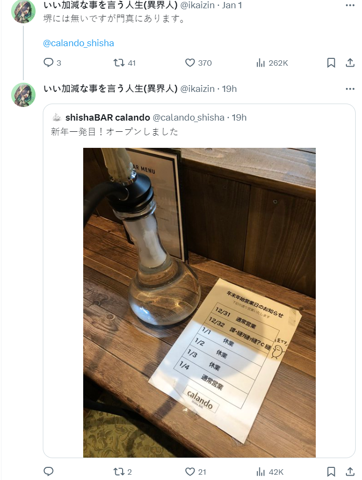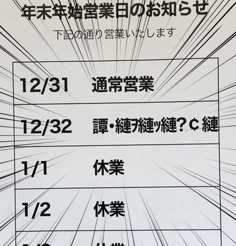 不過近日日本 X 上,有個店家的公告意外引起話題,在 12/31 到 1/4 之間,居然出現了 12/32 這個詭異日期,在旁邊還放上了「神秘文字暗號」看起來讓人覺得詭異又好奇,到底這是什麼玩意呢?