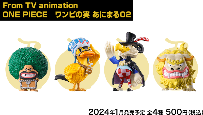 日本萬代玩具公司轉蛋事業部 GASHAPON 旗下高人氣的無殼環保轉蛋,以超人氣動畫《ONE PIECE 航海王》為主題,超人氣的「惡魔果實」系列,繼第一彈後,再度發表好評第二彈「From TV animation ONE PIECE 惡魔果實 動物02」轉蛋,一共有四種款式,一轉參考售價為 500 日圓,預計於 2024 年 01 月登場!