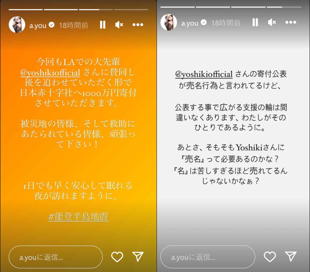 濱崎步在昨日 ( 1/4 ) 個人 Instagram 限時動態提到,也跟進 YOSHIKI 大前輩向日本紅十字會捐出 1,000 萬日圓,希望能夠救助所有受害災區的民眾,替他們打氣重振家園。