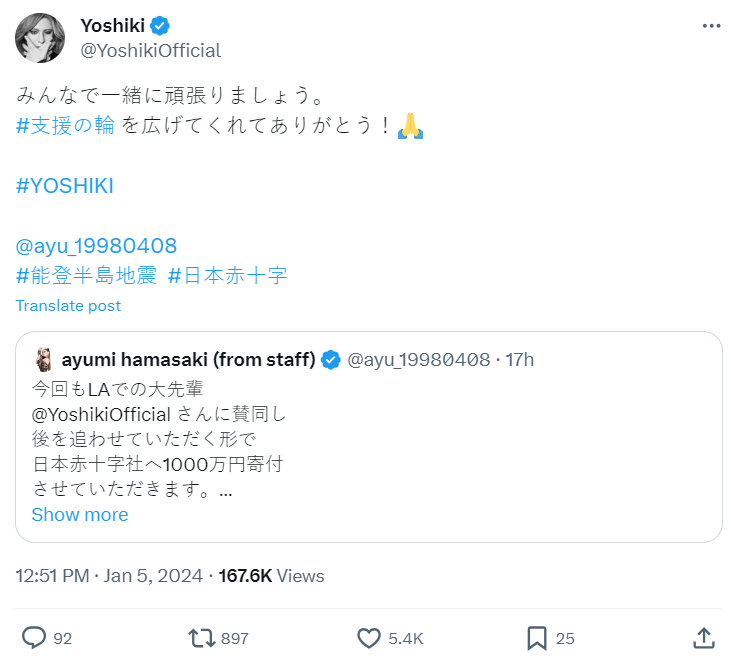 YOSHIKI 今日 ( 1/5 ) 則在個人 X 簡單回應,希望大家一起加油,聲援所有受災的朋友,似乎不受網路攻擊的影響。