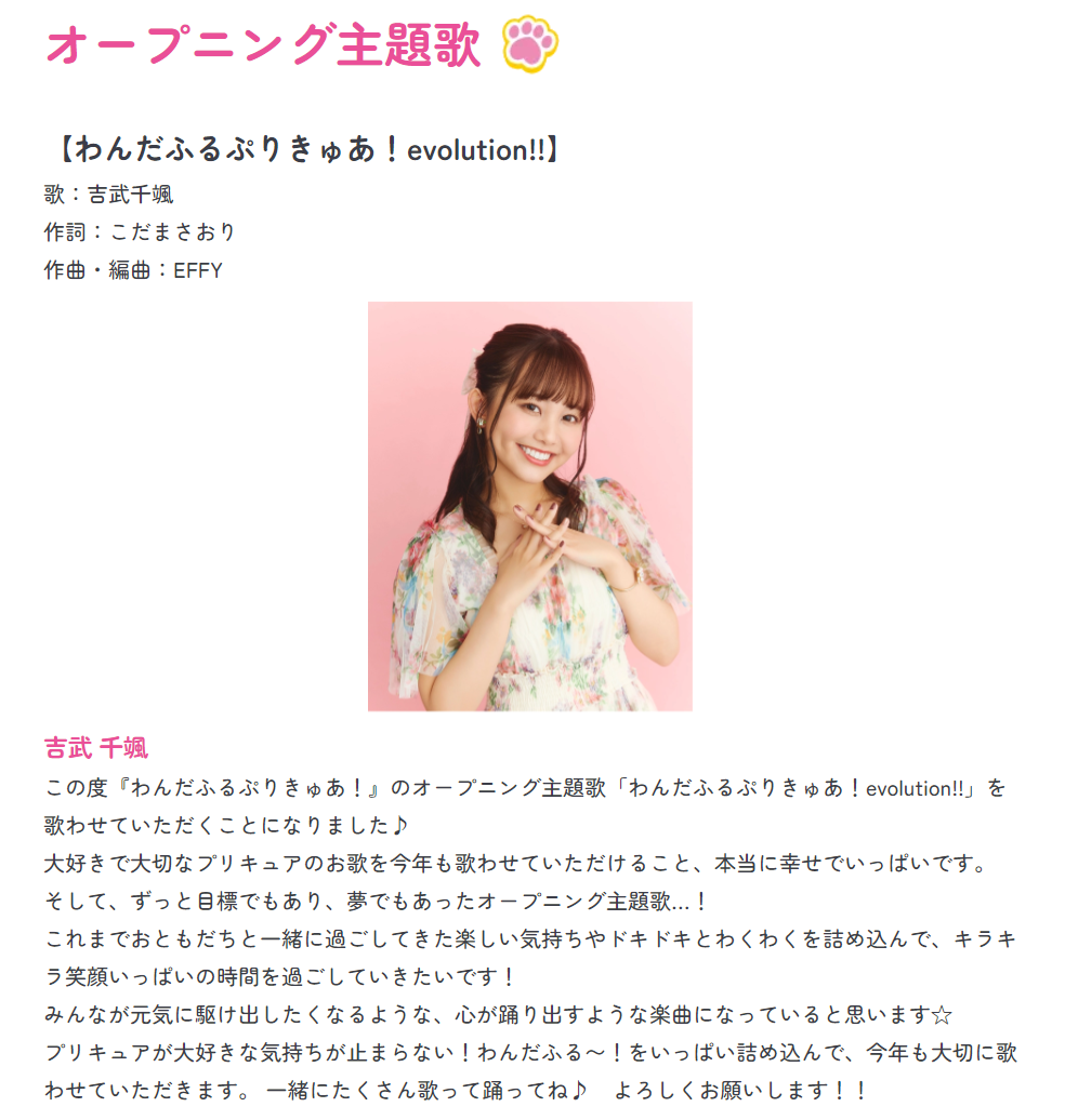 主題曲這次也公開,OP 片頭曲由歌手吉武千颯演唱「わんだふるぷりきゅあ!evolution!!」,她也是 20 作《開闊天空!光之美少女》片尾曲擔當。
