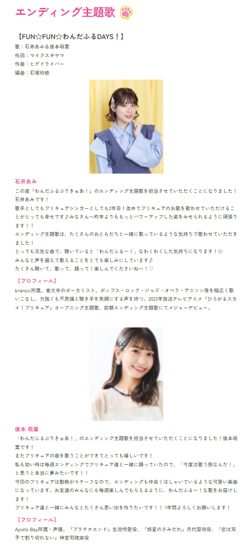 ED 片尾曲則由石井あみ與後本萌葉合唱的「FUN☆FUN☆わんだふるDAYS!」,兩人對這次能演唱系列作歌曲非常興奮,也期待開播的到來。