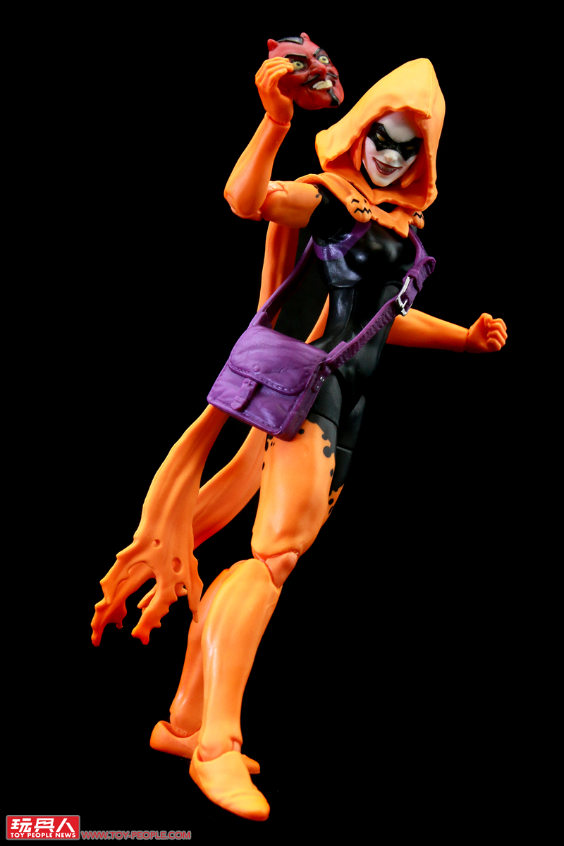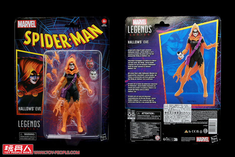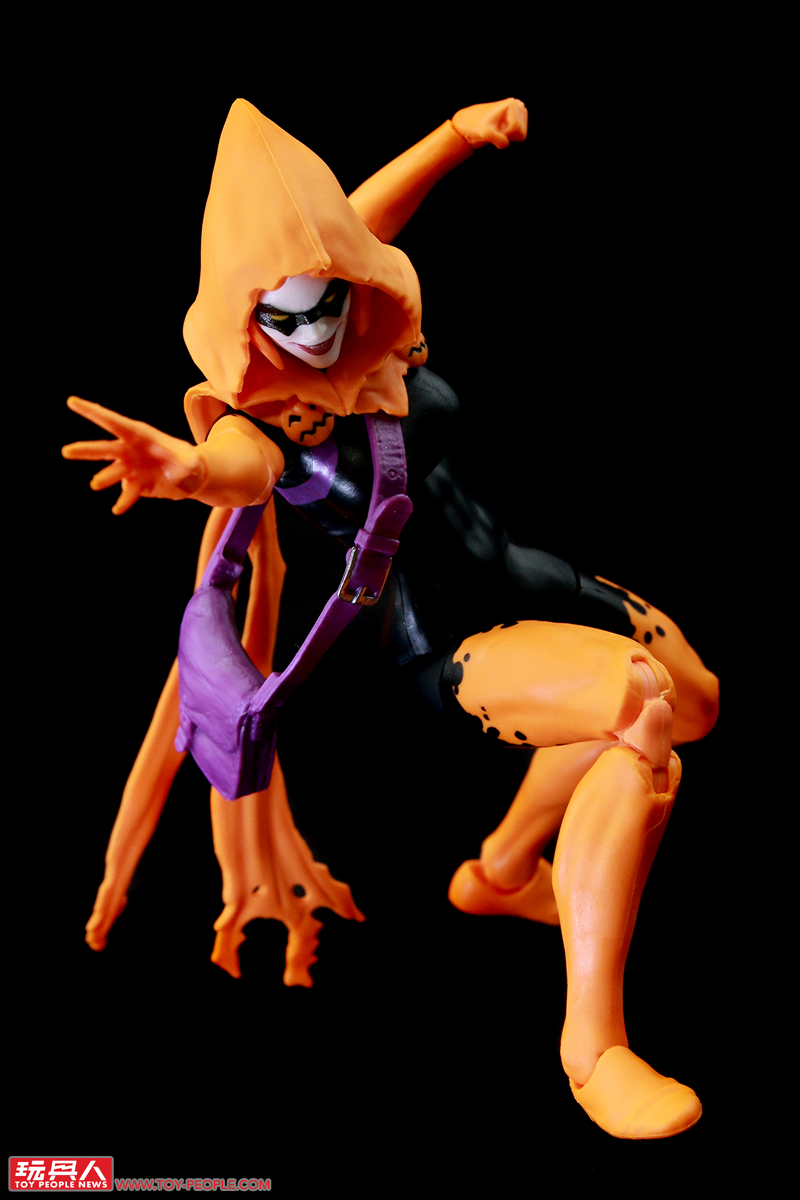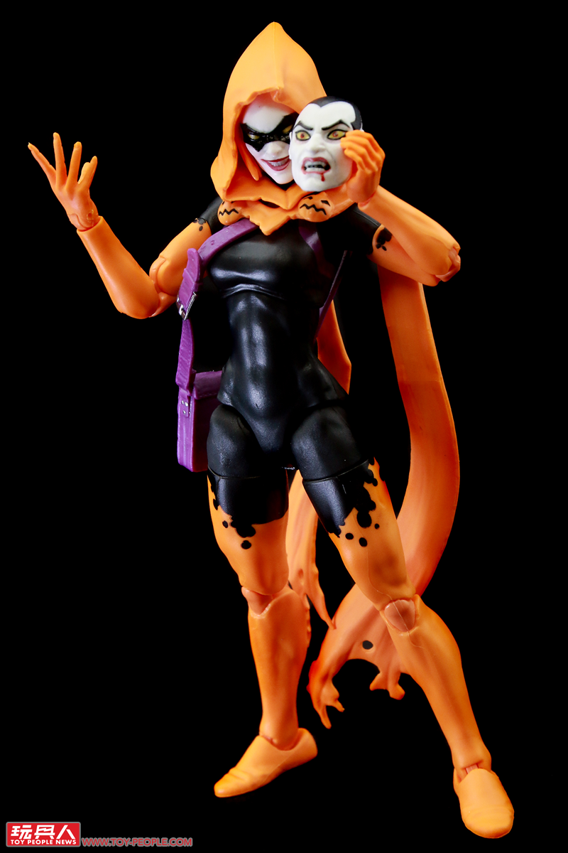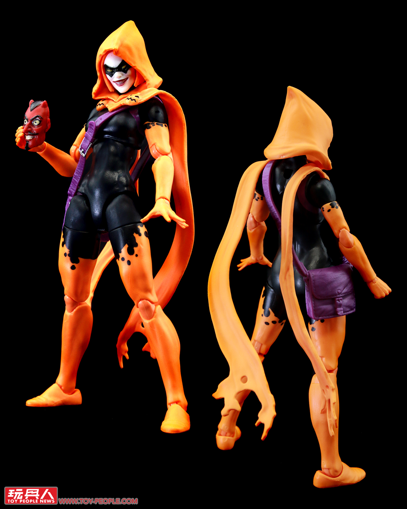 ▼「萬聖夜」(Hallows' Eve),取材自2022年的漫畫《驚奇蜘蛛人》(Amazing Spider-Man) 第6集第14期。本名伊莉莎白‧泰恩(Elizabeth Tyn),但更廣為人知的是她的另一個身分:珍寧‧歌德比(Janine Godbe)。珍寧與班·萊利是一對戀人,在哥布林皇后(Goblin Queen)、也就是琴‧葛雷(Jean Grey)複製人瑪德琳‧普萊爾(Madelyne Pryor)的協助下,以魔法力量化身為萬聖夜,能夠創造出各種不同的面具,並運用它們各異的奇幻能力。