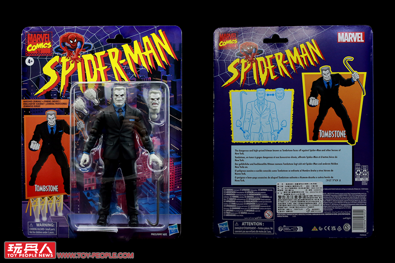 ▼「墓碑」(Tombstone),最初登場於1987年的漫畫《蜘蛛人之網》(Web of Spier-Man)第36期,本名阿隆佐·林肯(Alonzo Lincoln),是個自小患有白化症的黑幫成員,在接觸了化學物質Diox-3後,他的皮膚成了刀劍難傷、耐電耐高溫的駭人裝甲,這讓他成了金霸王(Kingpin)麾下令蜘蛛人頭痛的超級罪犯之一。