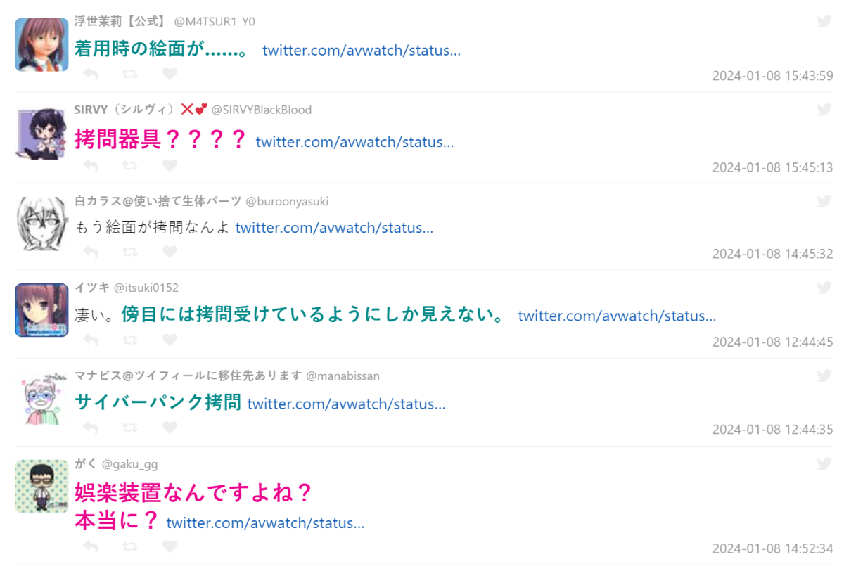 不過網友對於這著用的示範圖感到困惑,這樣的樣貌簡直像是 Cybepunk 作品中的穿搭配置外,更像是拷問器具,看起來不像是娛樂裝置,戴起來感覺有種難以言喻的違和感。