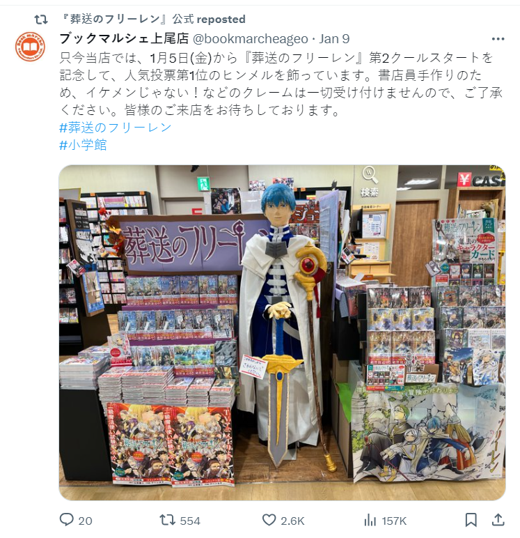 最近在日本埼玉的書店ブックマルシェ上尾店,就貼出了在店內自製擺設的「欣梅爾雕像」,以官方投票第一名的欣梅爾佇立在店內的芙莉蓮區域,微妙的神韻也引起網友關注,芙莉蓮官方 X 也跟著轉推。