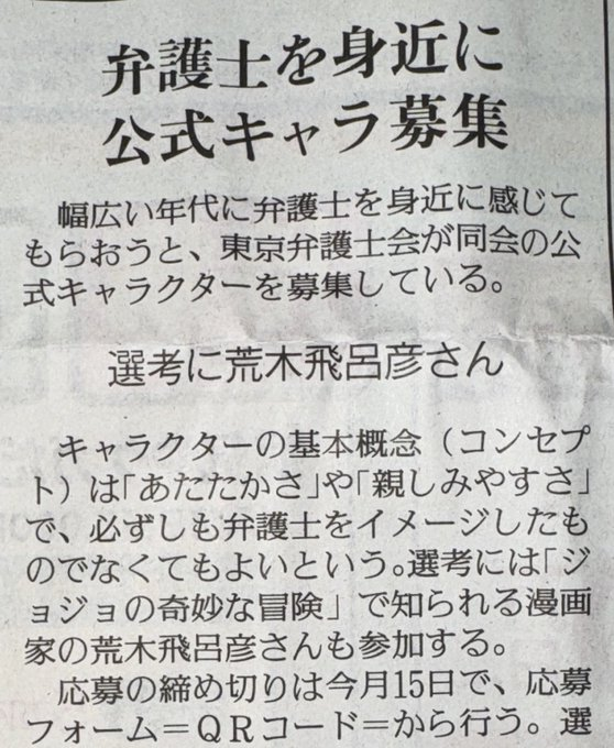 近日日本東京律師會 ( 東京弁護士会 ) 宣布,將找來荒木飛呂彥擔綱官方形象角色選拔的選考委員,替協會選出適合的「公式形象角色」( 也就是吉祥物 ),引發網民迴響與關注。