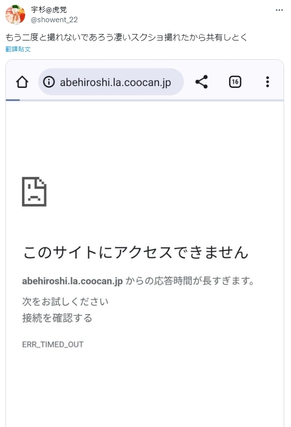 雖然說網頁連線時間過長也有可能是 Proxy 或是其他方面的問題,但畢竟上面的「回應時間過長」幾個字與阿部寬官網搭配起來也實在是太過震撼,也就難怪日本網友們的反應會如此激烈了。