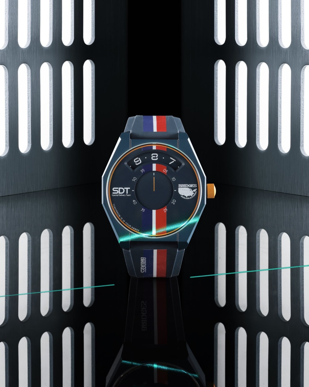 從外觀上可以看到, Anicorn Watches手錶上頭不僅含有布橋斯(Bridges)的Logo,不可或缺的紅白藍條紋更是將整體錶型設計得維妙維肖,不僅不失《死亡擱淺》裡三輪機車的特色,同時還展現出 Anicorn Watches手錶獨有的個性。