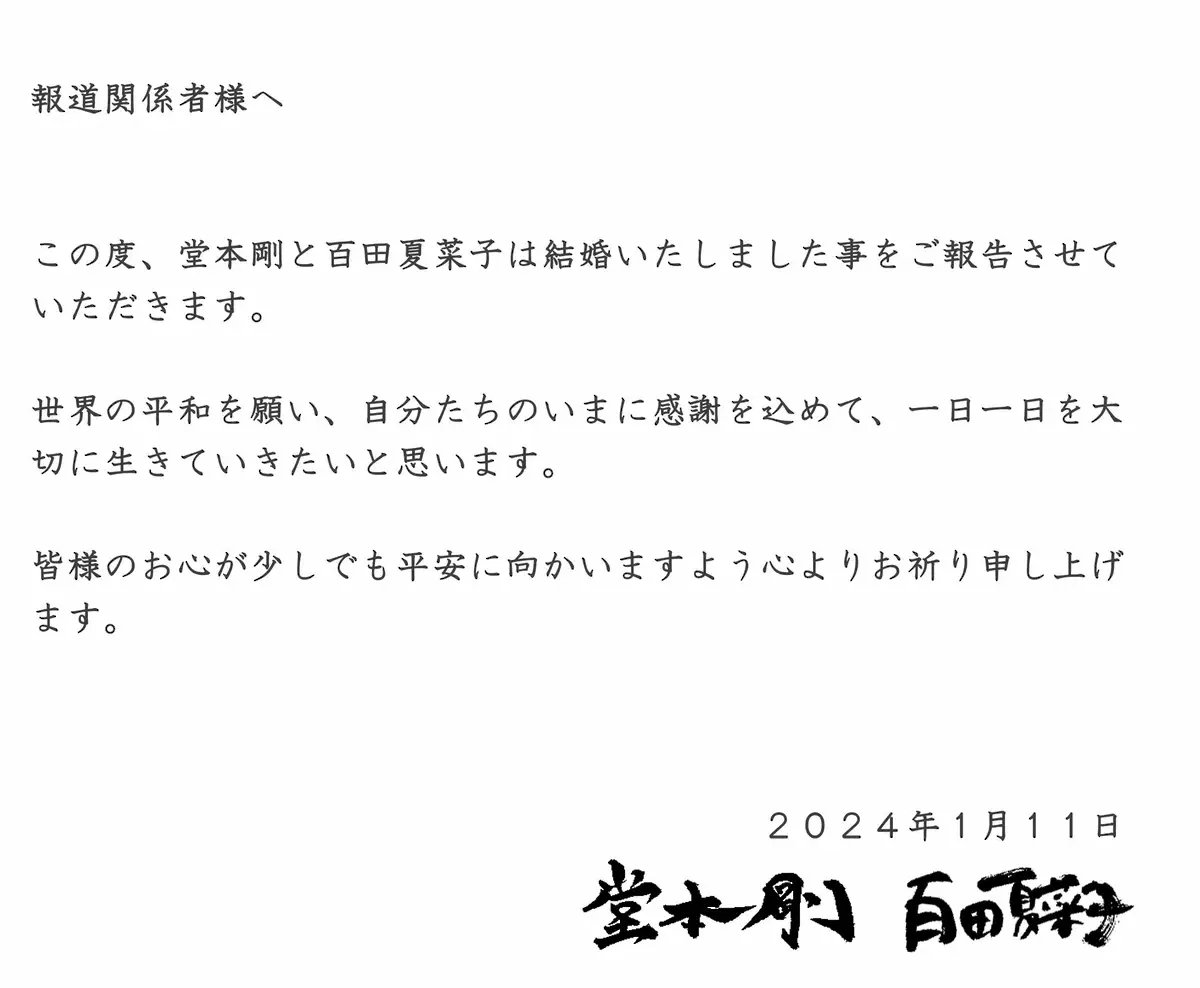 兩人透過事務所共同發表書面聲明,寫道 : 「這次,堂本剛和百田夏菜子結婚了,我們向大家報告這一消息。希望世界和平,懷著感激之情,我們想要珍惜每一天。衷心祈願大家的心靈能夠更加寧靜。」