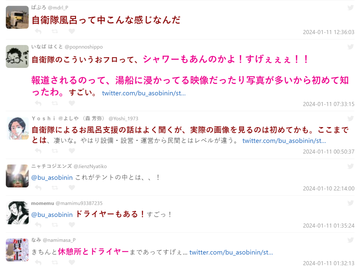 對於自衛隊協力完成的澡堂,多數網友都表示非常讚賞,沒想到自衛隊的所學能夠實踐在天災之際,幫助災區民眾生活所需。