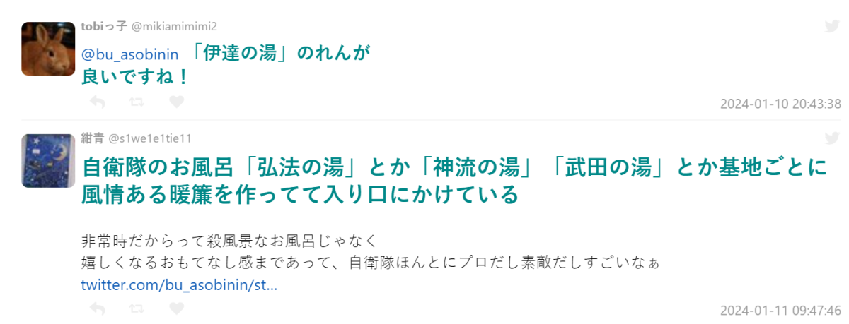 「伊達的湯」暖簾也備受網友肯定,其實自衛隊的澡堂都會使用類似的形式製作,各種名字都會出現在基地內部,也是獨有的精神風情。
