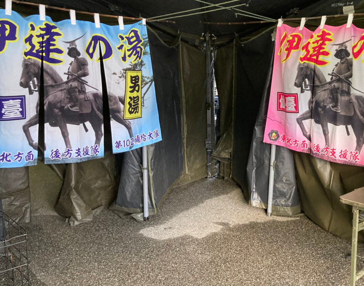 臨時的澡堂由地方政府提供資源並請求自衛隊協力完成,使用門前町的門前兒童中心搭建,自衛隊也幫助發放整理券讓災區民眾守秩序的使用。