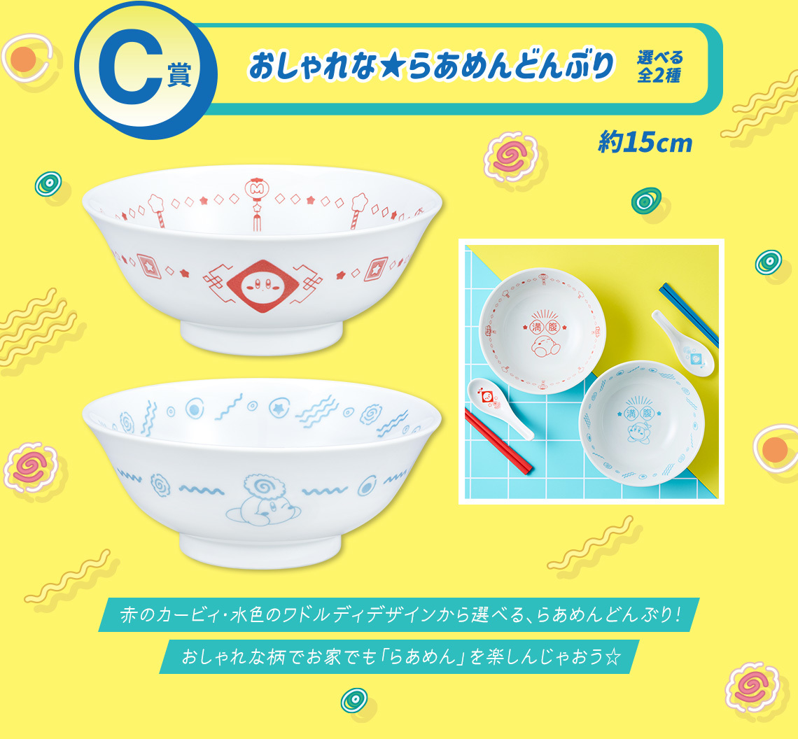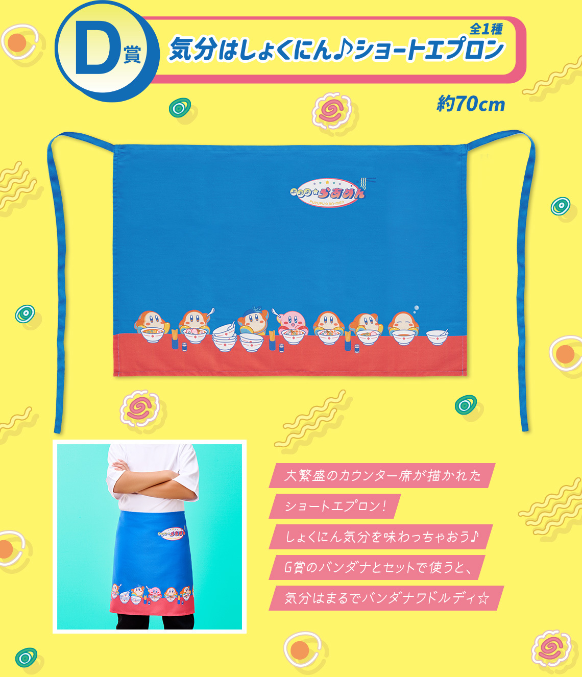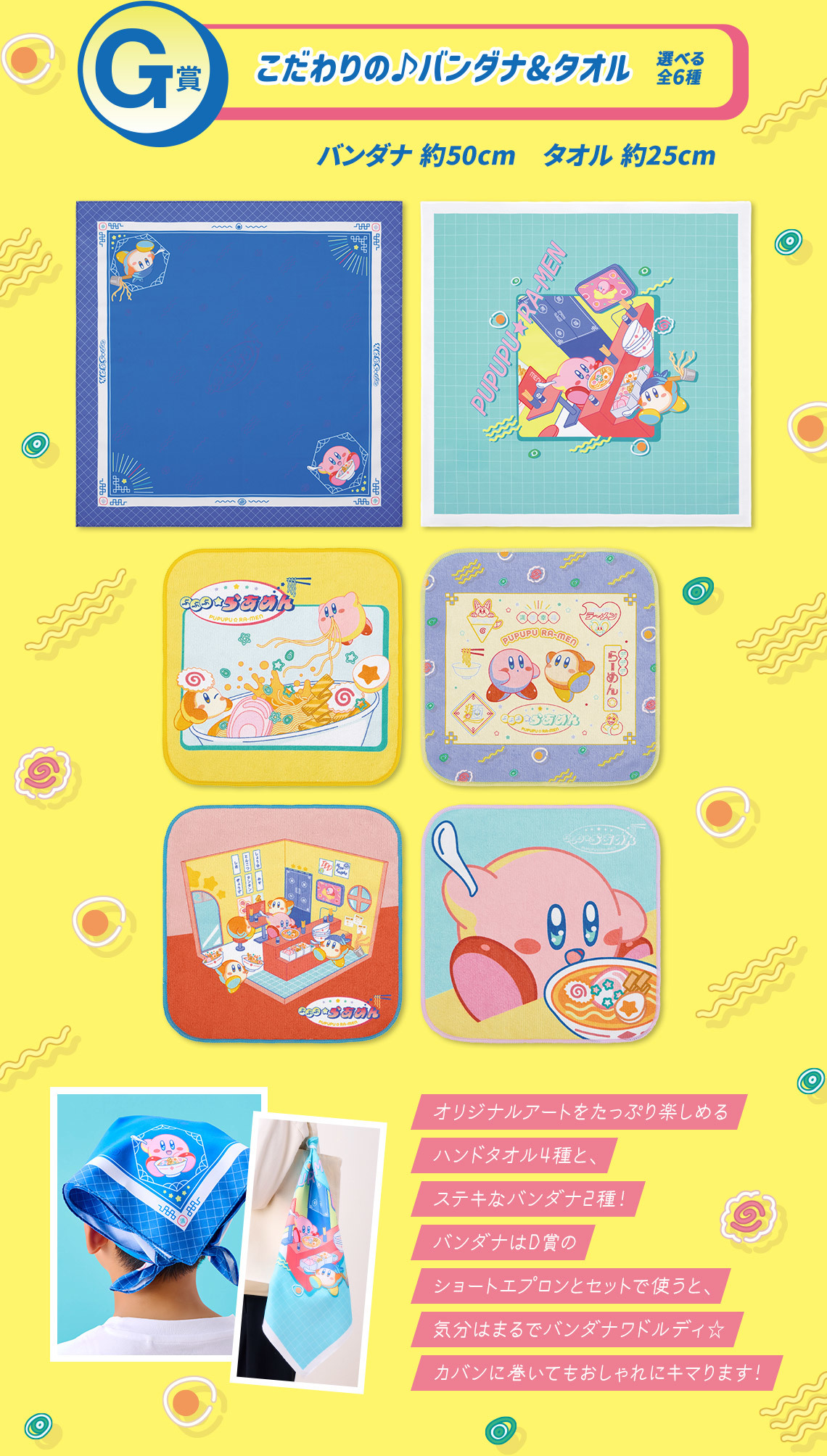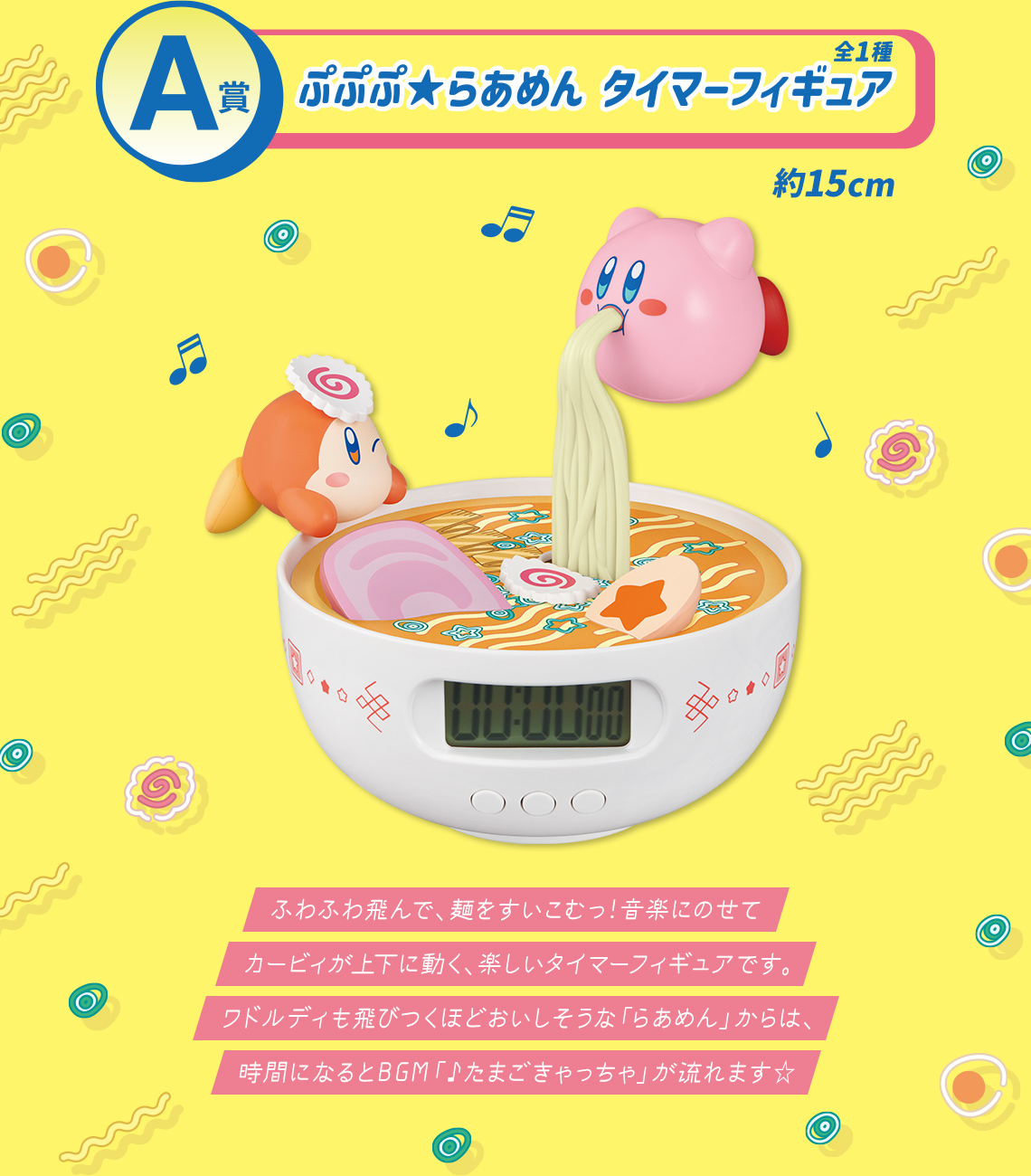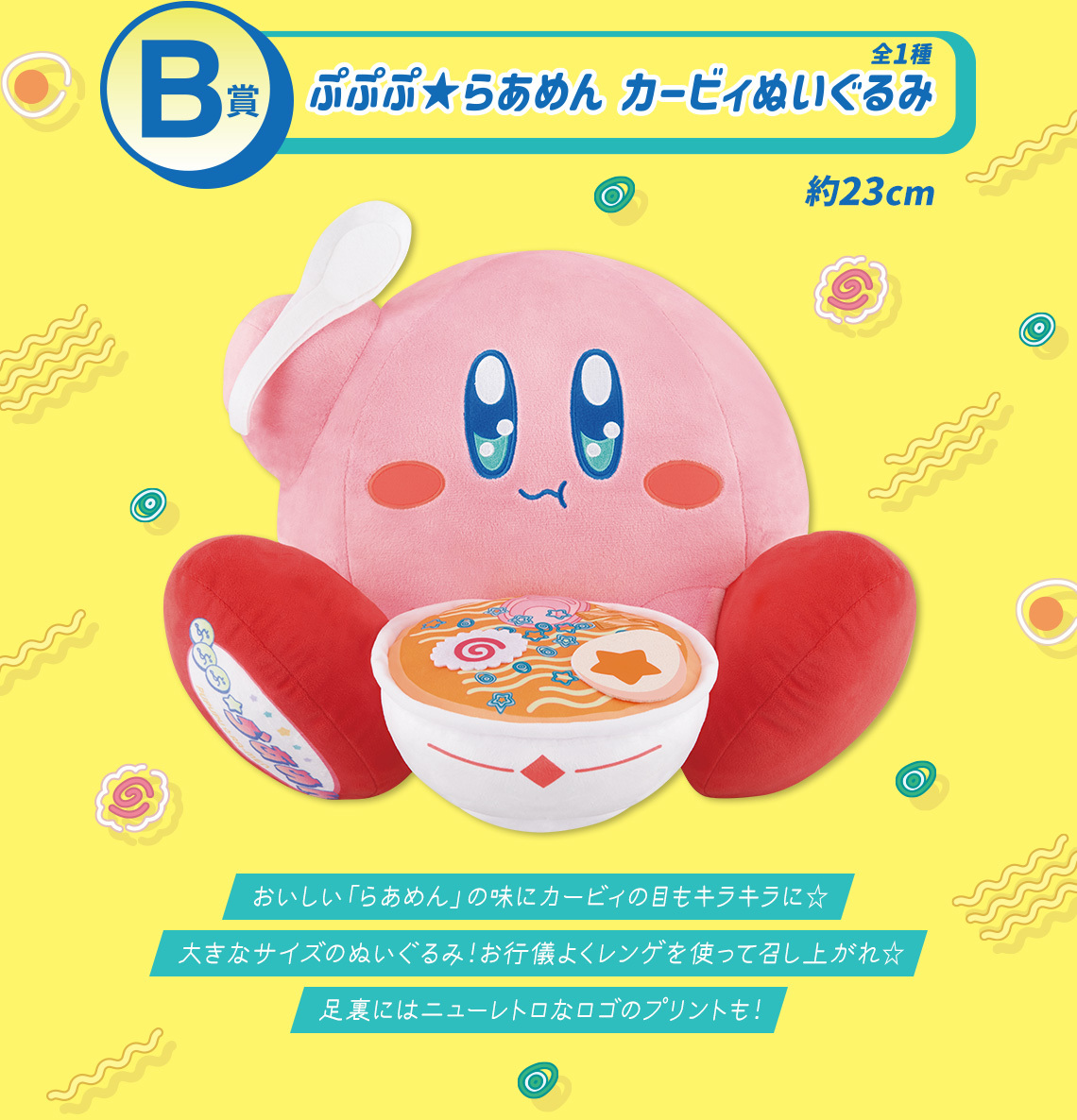 「一番賞 星之卡比 噗噗噗★拉麵」,將拉麵美食結合主角卡比,推出 A ~ H 賞 + Last One賞、雙重中獎機會等不同級別的豐富獎品!收錄有飛在空中吸吮麵條的 A賞「噗噗噗拉麵計時器模型」、吃著拉麵的 B賞「噗噗噗拉麵 卡比布偶」、C賞「拉麵碗」、 D賞「心情好♪短圍裙」,以及 E賞「好方便♪餐具」、F賞「全新復古設計★橡膠精選」、G賞「特別 ♪ 頭巾和毛巾」、H賞「可愛文具」,以及Last One獎的「頭巾瓦豆魯迪布偶」,讓超可愛的卡比與拉麵圍繞你的生活~