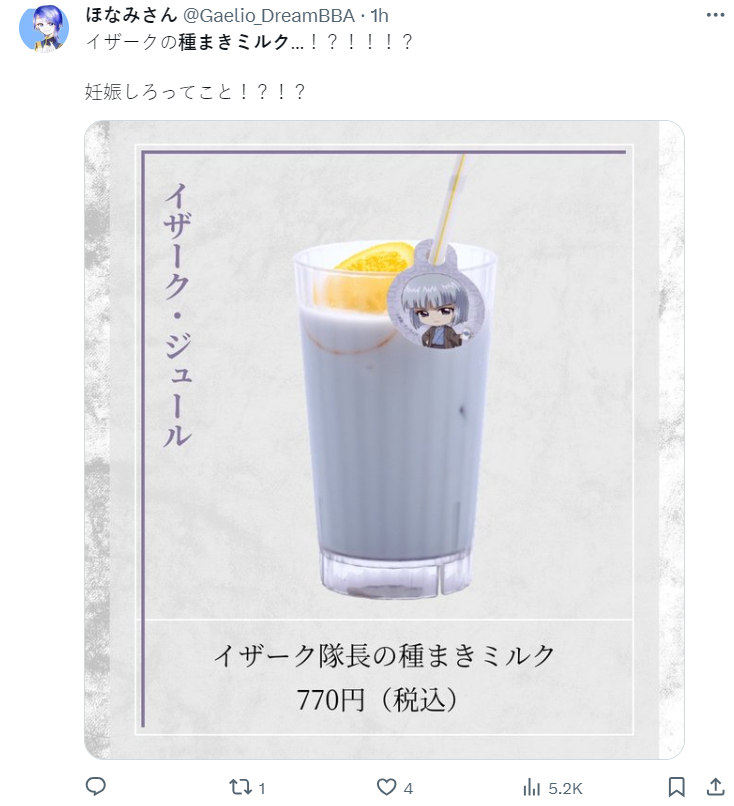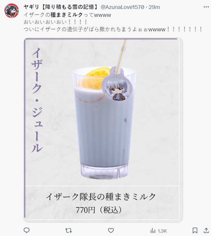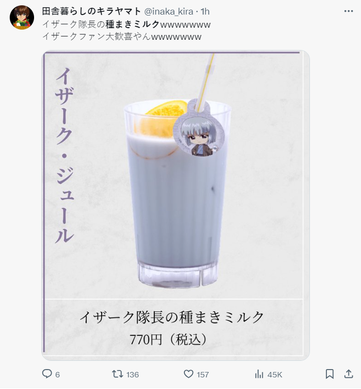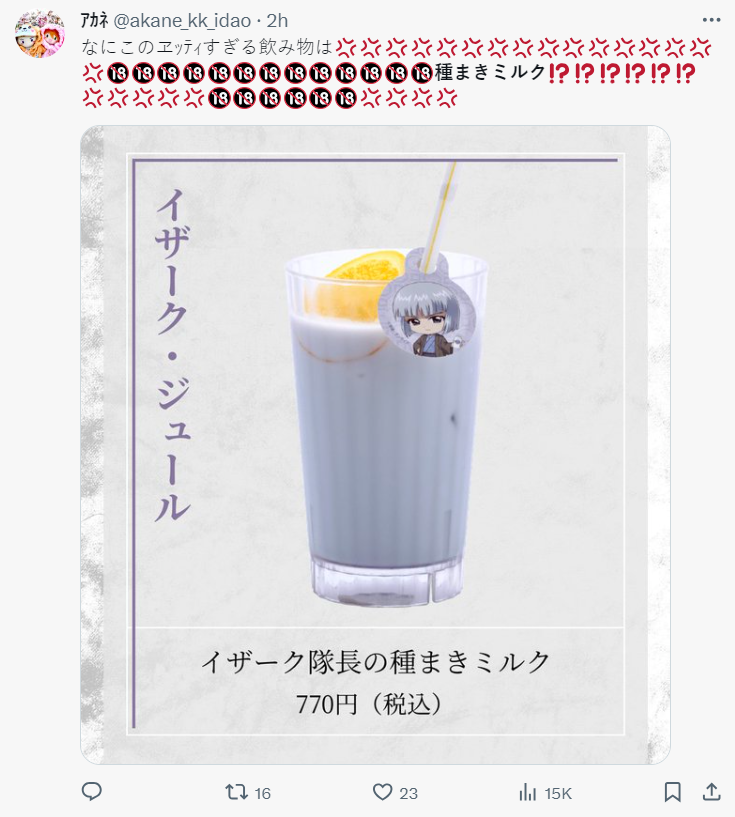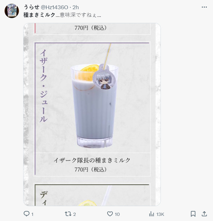 活動項目先不提,合作餐店中的飲品「伊薩克的播種牛奶」( イザーク隊⾧の種まきミルク ) 卻已登上 X 趨勢引發熱議,不少網友困惑到底為何會取這樣的名字,讓人匪夷所思。