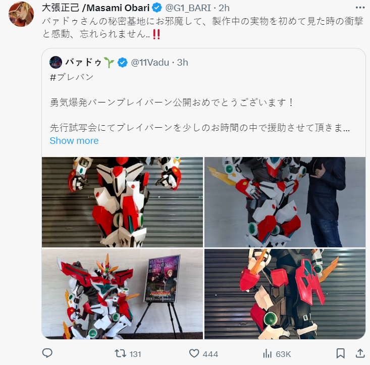 バァドゥ將監督大張正已所設計的機器人「Bravern」可說是完美還原製作出來,連大張監督本人都大為讚賞他的製作功夫,被官方認可對於一個 Cosplay 製作達人絕對是最高的讚美。