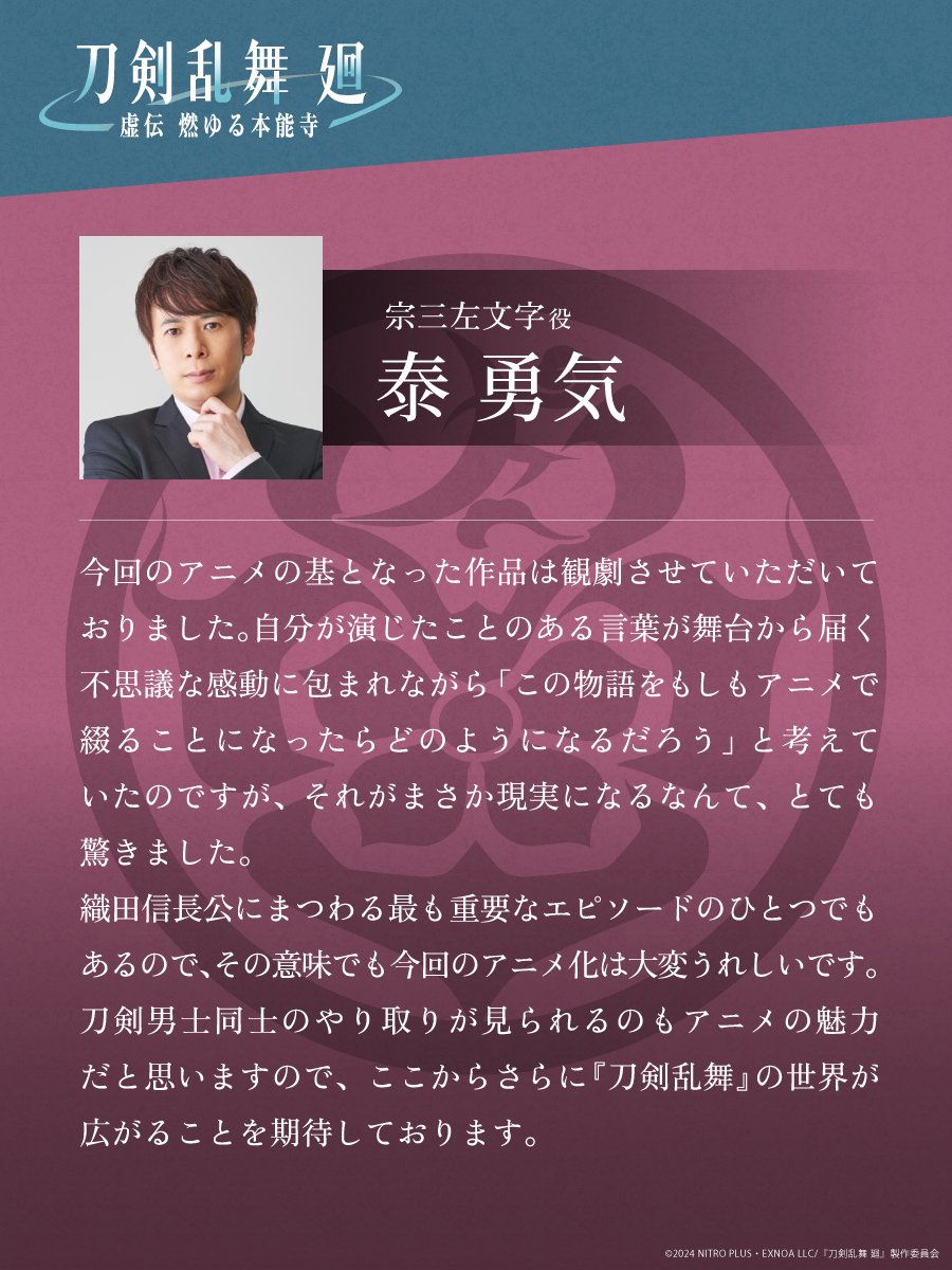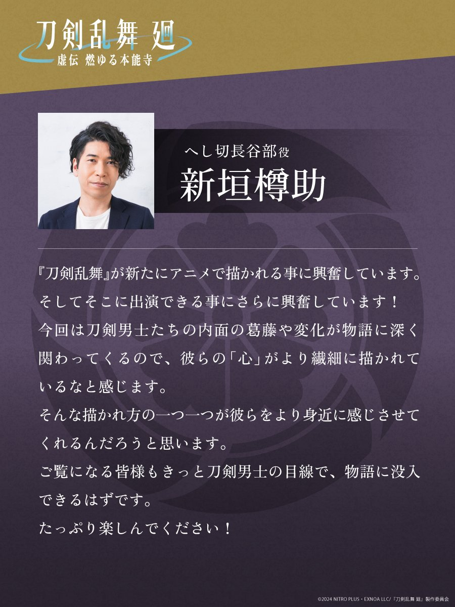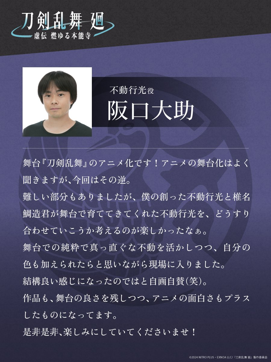 另外這次《刀劍亂舞 迴 -虚傳 燃燒的本能寺-》是沿用同名舞台劇的劇情,找來原舞台劇腳本家末滿健一擔綱系列構成,他也表示從事相關舞台劇已經有不少作品,以刀劍亂舞的世界觀來說非常廣大,自認為一步步以來都是挑戰,這次到了動畫的,能參與腳本感到非常光榮。