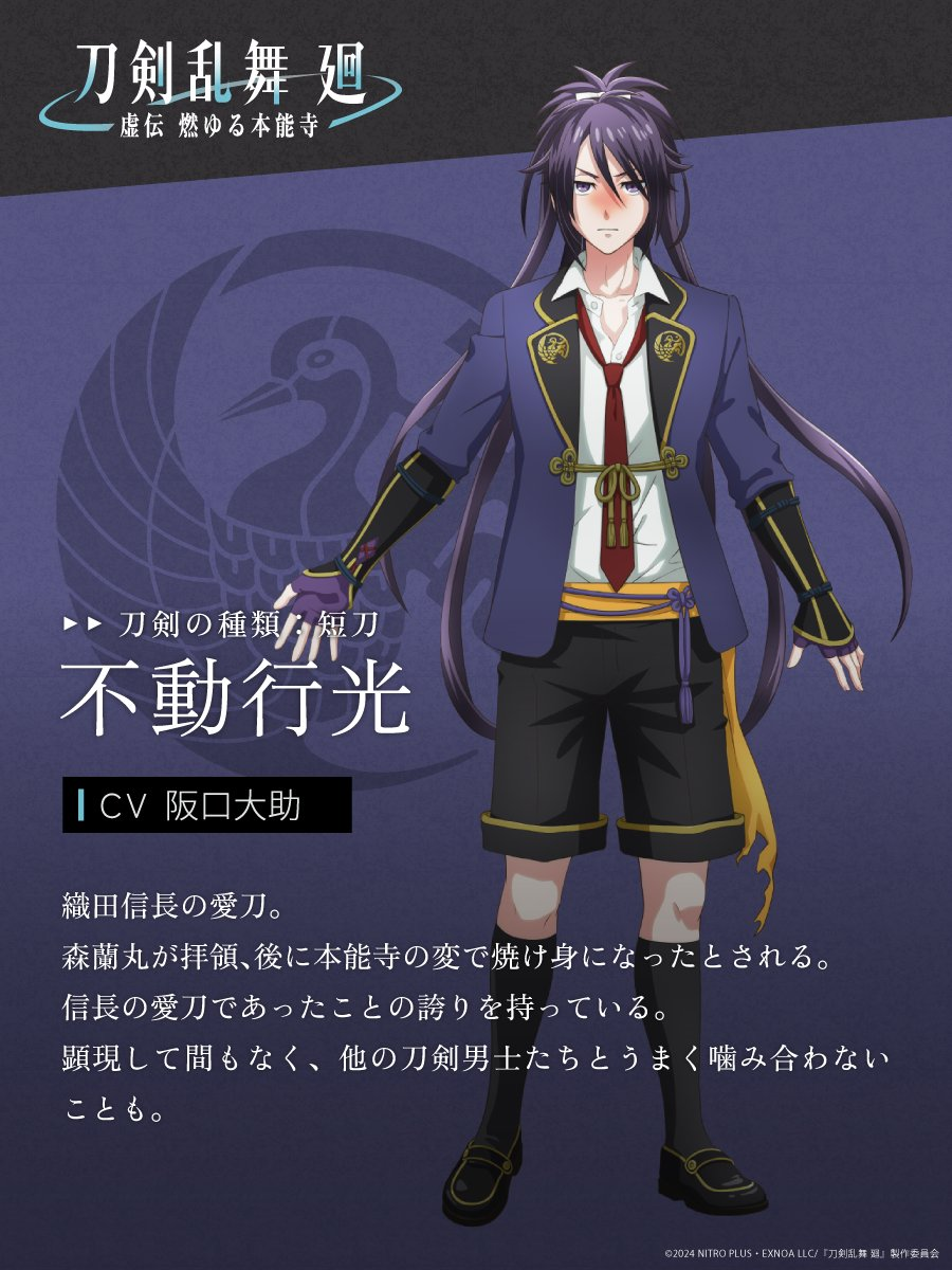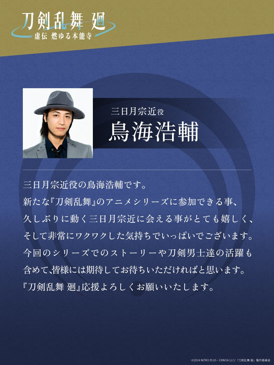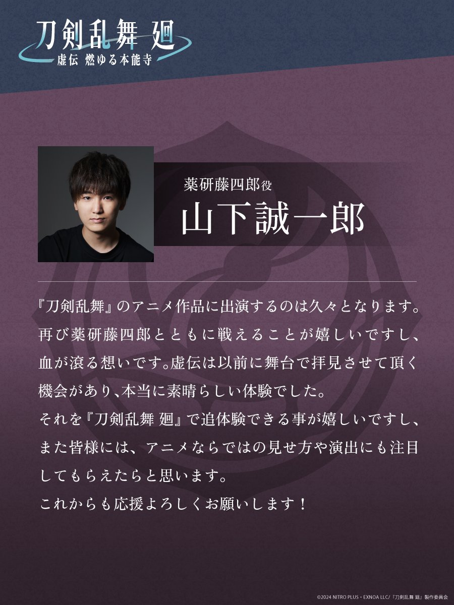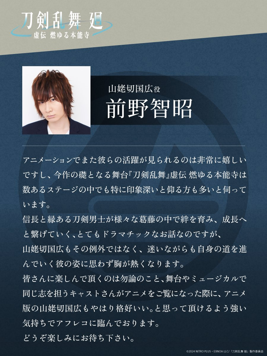 另外這次《刀劍亂舞 迴 -虚傳 燃燒的本能寺-》是沿用同名舞台劇的劇情,找來原舞台劇腳本家末滿健一擔綱系列構成,他也表示從事相關舞台劇已經有不少作品,以刀劍亂舞的世界觀來說非常廣大,自認為一步步以來都是挑戰,這次到了動畫的,能參與腳本感到非常光榮。