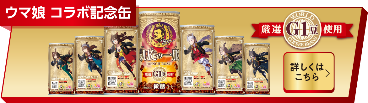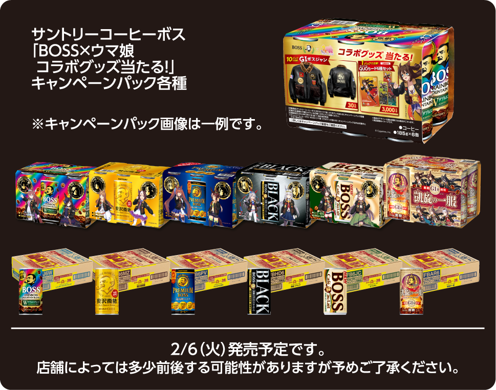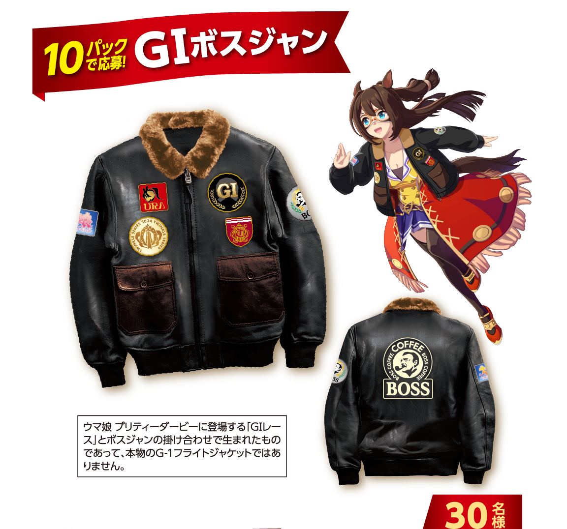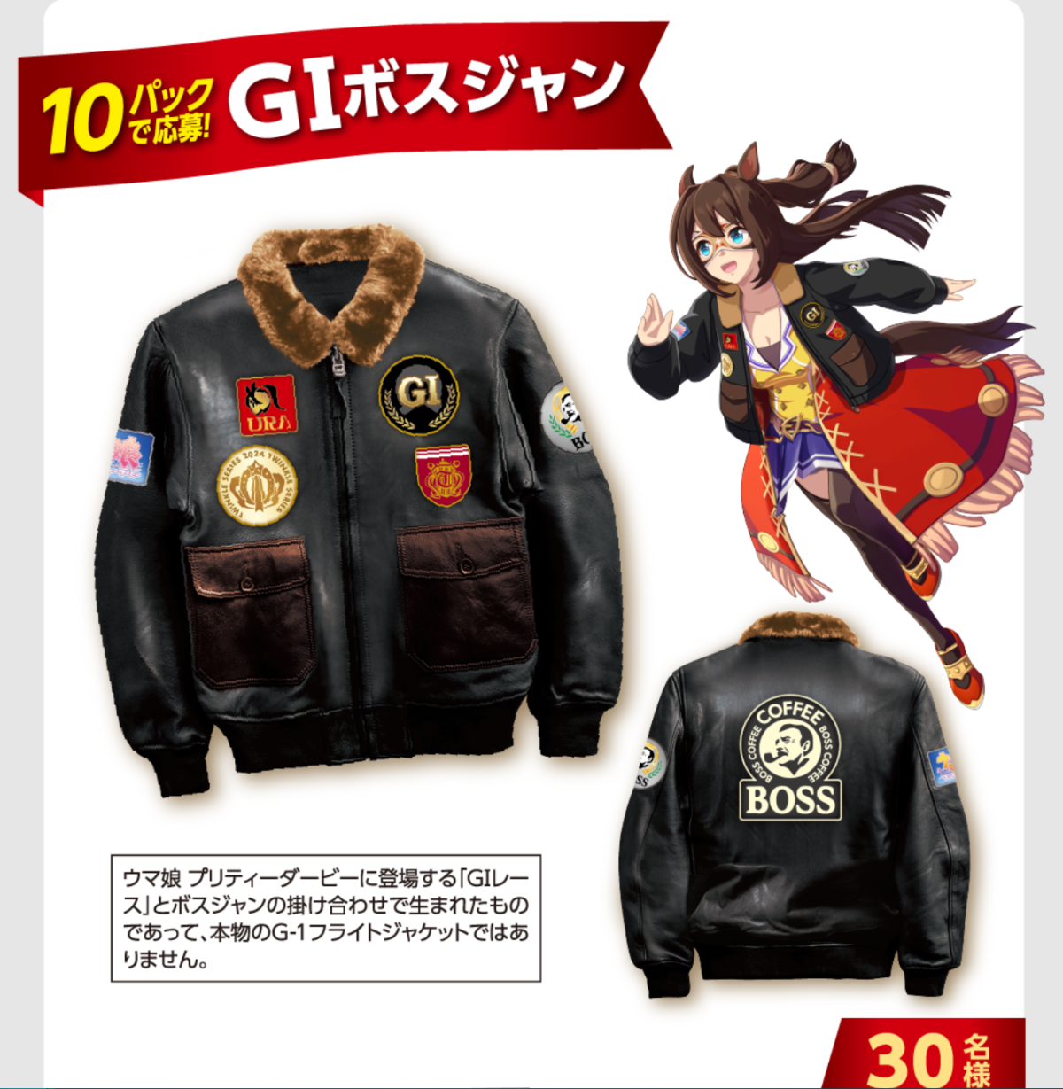 只要購買紀念罐六罐套組,就有機會參加抽獎,首獎就是「GI 賽事 BOSS 夾克」,以馬娘最為人知的 GI 賽事為題材製作的夾克外套,以正統軍裝 G-1 夾克來打造,除了毛領與皮革外觀外,胸前與手臂都有合作專屬的布章,背後更大大印上 BOSS 的 Logo,十分帥氣實搭。