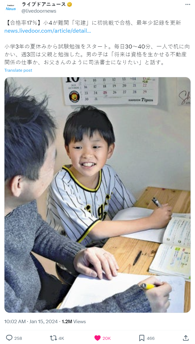 不過在日本今日 ( 1/15 ) 新聞報導一則驚人的消息,國考「宅建士」今年出現了一名史上最年輕的上榜者,是一位僅小四 10 歲的考生,突破了先前 12 歲的紀錄,讓網友感到驚訝不已。