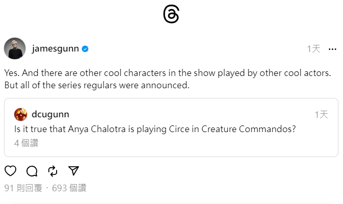 由 DC 影業總裁-詹姆士岡恩(James Gunn)親自編劇所有集數的動畫影集《生物突擊隊》(Creature Commandos)日前曝光了最新一位配音卡司,近年因出演《獵魔士》(The Witcher)影集「葉奈法」一角打開知名度的英國女星-安雅夏隆查(Anya Chalotra,上圖)將在劇中為 DC 漫畫的魔法系惡棍「瑟西」獻聲。岡恩不久前在 Threads 回覆網友時證實了夏隆查的加入。