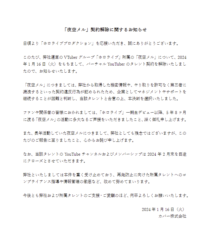 Cover 在官方聲明中指出,夜空梅露因向未獲許可的第三者洩漏公司內部機密違反契約,經公司考慮過後認為無法繼續給予支援與管理,因此雙方達成共識決議解約。