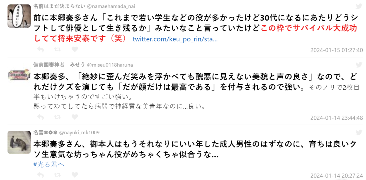 不少人也讚嘆本鄉出道許久,過去曾講過「目前為止,我扮演過很多年輕學生等角色,但現在我已經30多歲了,作為一名演員,我該如何轉變和生存?」,這次演出 NHK 大河劇可說是讓人看到了他的進步與身為一位演員的能耐,看來不需擔心自己的生存了 XD。