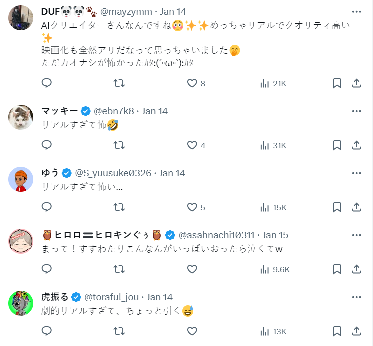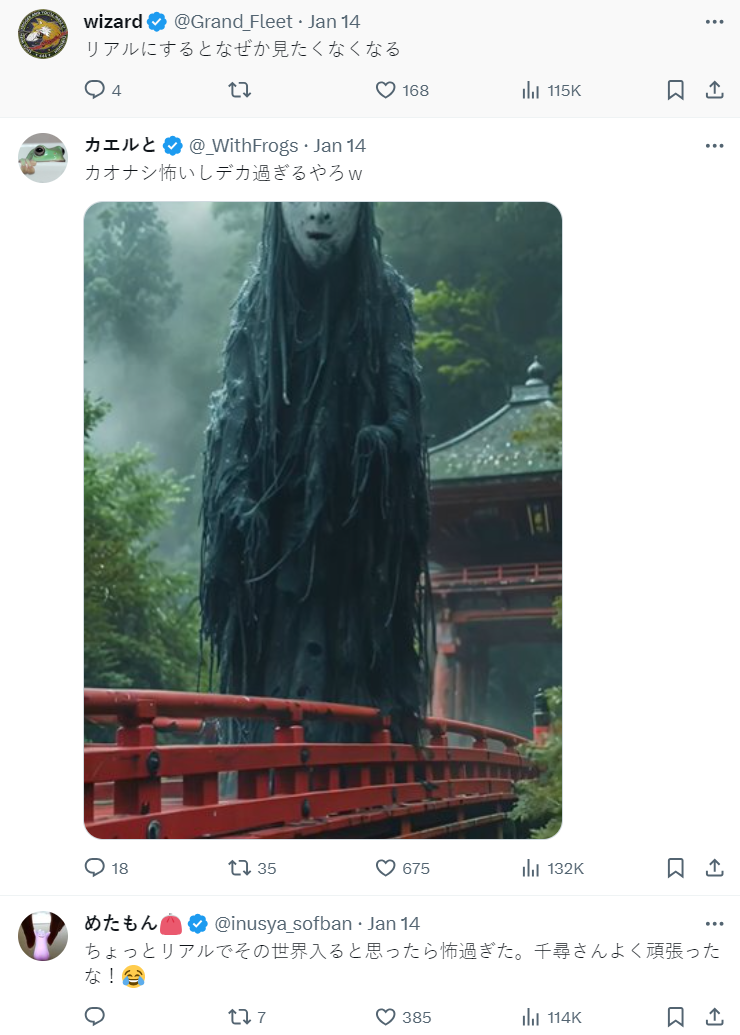 將吉卜力原先的可愛畫風帶入寫實風格後,不少網友感覺這樣的效果十分恐怖,甚至帶有一點克蘇魯的味道在,自嘆如果是真實世界,作為主角的千尋或許是體驗彷彿可怕的奇幻遊戲世界。