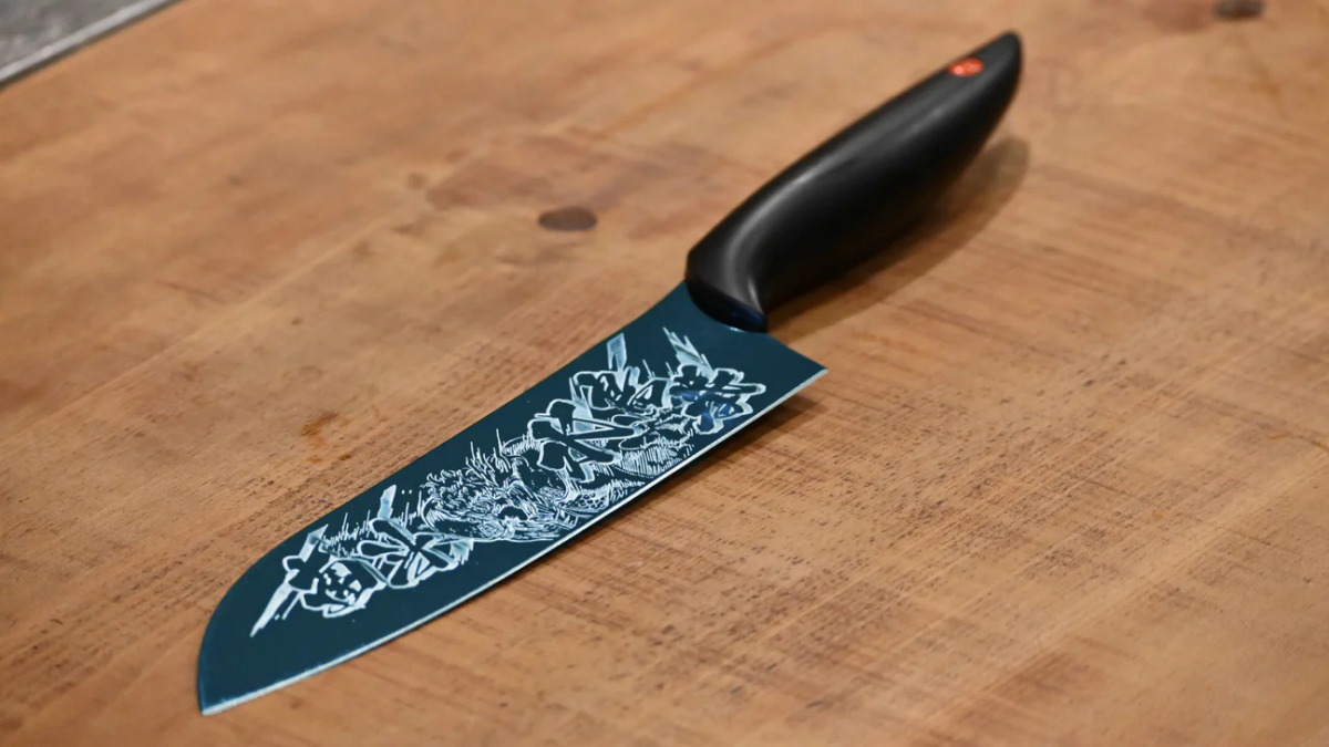 「南斗水鳥拳三德包丁」以料理刀具最出名的三德包丁為基礎,自家自豪的「霞KASUMI チタンコーティング」來製作。特別以藍色的鈦金屬塗層製作,刀刃上以雷射製成的「南斗水鳥拳」圖案設計採用原作風格完美呈現,每件作品都是以職人技術打造,賦予其細緻又動感的外觀。