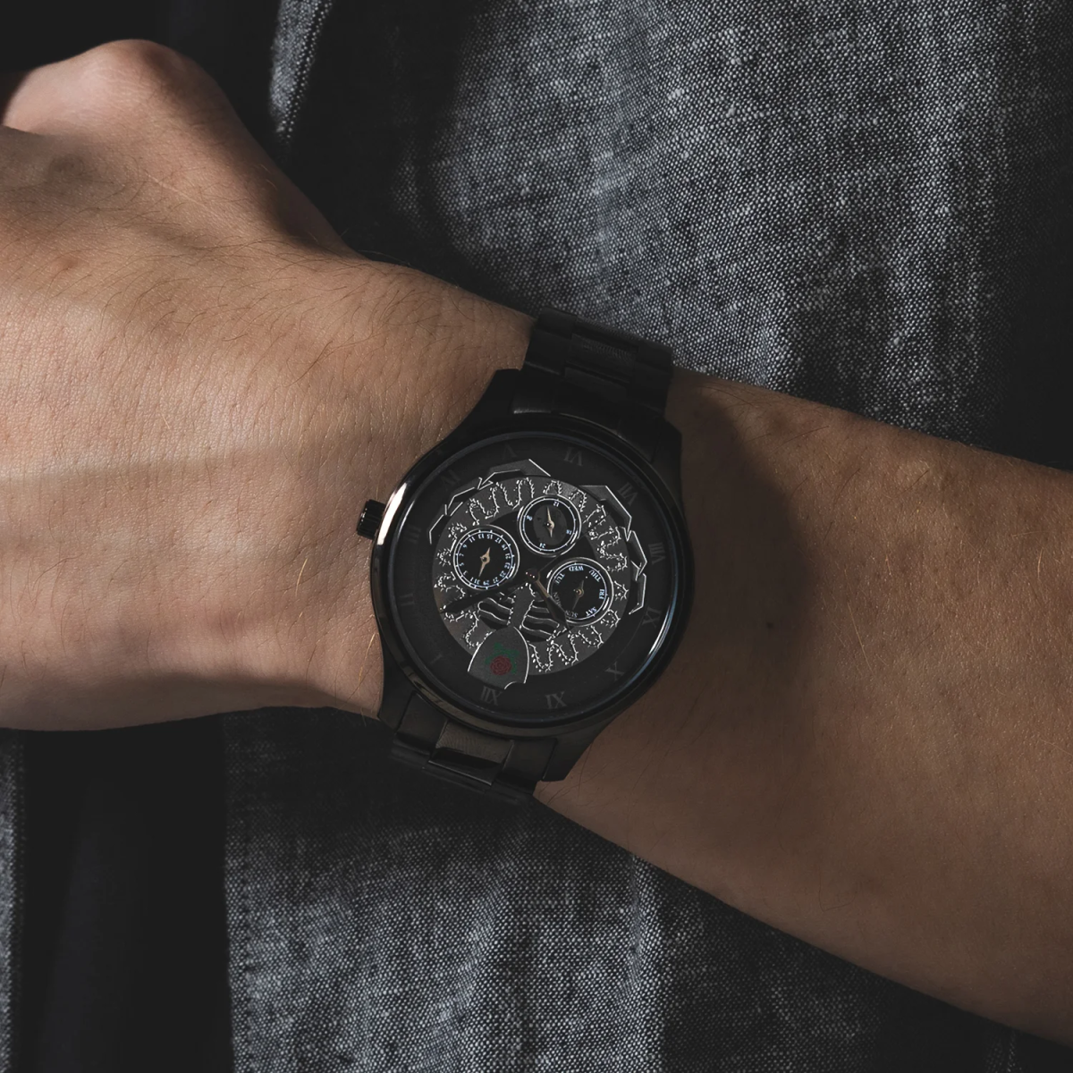 以骷髏騎士為形象設計,錶盤上可以看到以骷髏為概念設計外,周圍更環繞著荊棘,錶身帶有復古色系的設計也象徵骷髏騎士的身分與背景。