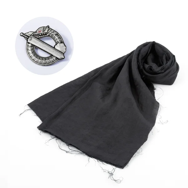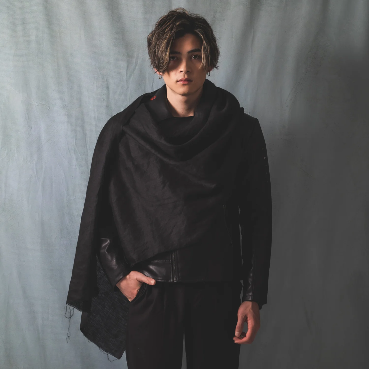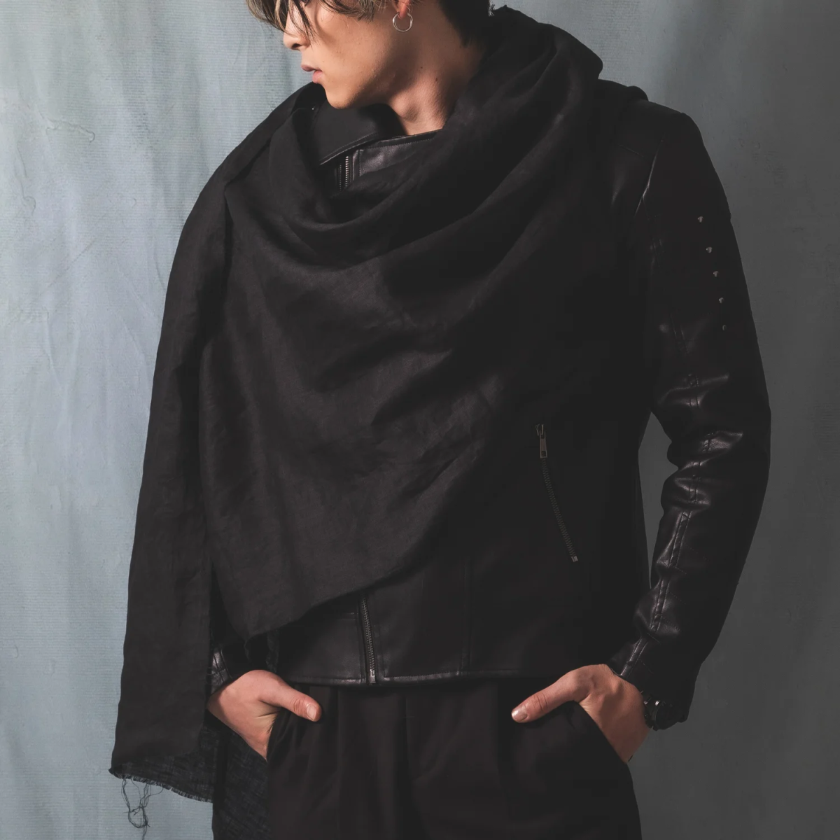 以黑色的保暖披肩並配上專屬的金屬鎧甲別針做搭配,雖說黑色披肩本身僅以未包邊的流蘇二手風呈現,但配上專屬別針後別有獨特風味,適合搭配同款皮衣穿著。