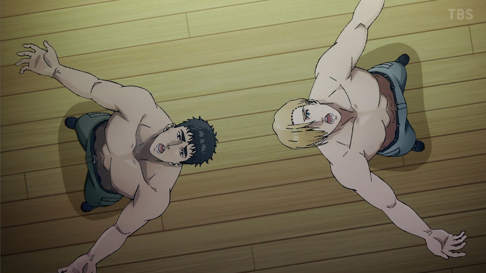 不過格外引起話題的,是首次披露的 ED 片尾曲「双炎の肖像」,勇蒼與史密斯兩人宛如歌舞劇演唱外,唱唱還脫下上衣裸著上半身,甚至手貼手一起唱歌,不少日本粉絲吐槽表示 : 「到底為何唱歌要脫衣服阿 www。」