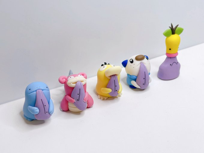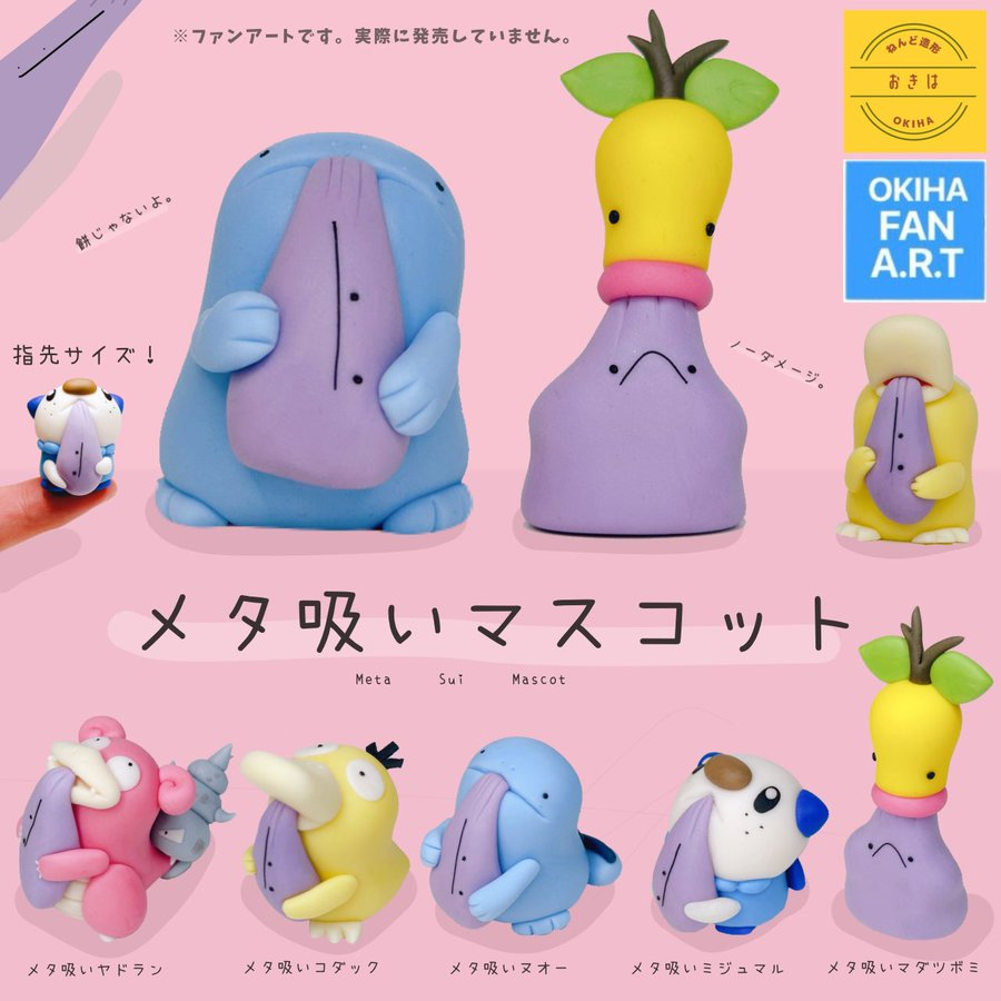 這次概念是「吸著百變怪的寶可夢」,選擇直接讓這些寶可夢把百變怪當作食物 ( ? ) 一樣用嘴叼著,包含 : 沼王、呆河馬、可達鴨、水水獺與喇叭芽來助陣,特別製作成像是正規扭蛋的宣傳圖一樣,讓人直喊想要商品化,超級可愛的啦 !