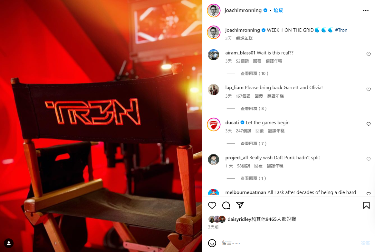 由《黑魔女 2》(Maleficent:Mistress of Evil)導演-喬奇姆羅寧(Joachim Rønning)接手掌舵的《創:光速戰記》(Tron:Legacy)系列第三部曲《創:戰神》(Tron:Ares)已於前幾天正式開拍,羅寧上週六在 Instagram 貼出了一張片場照(下圖),並向粉絲透露劇組已經完成第一週的拍攝。